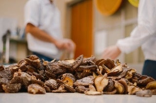「森のバーニャカウダ」は、椎茸のうまみを最大限引き出すために冷水を使ってゆっくりと戻すことにより、椎茸本来の風味を活かす味付けにこだわっています。さらに「森のバーニャカウダ」には、乾しいたけ以外にも伝統的な食材が使われています。ひとつは「木桶しょうゆ」で、木桶を使ってゆっくりと醸造する昔ながらの製法で作られた醬油と、「発酵大根」です。宮崎の農業遺産でもある櫓大根(畑に櫓を組み、寒ざらしで乾燥させた大根)で作られた、干し大根を塩だけで醗酵させた漬物が入っています。