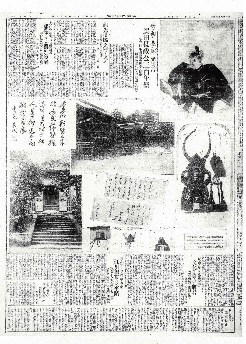 昭和20年の福岡大空襲により、「大水牛の兜」を含めた数々の宝物が焼失してしまいましたが、今から遡ること約100年前、「長政公三百年祭」の様子を報じた新聞には、当時光雲神社が所有していた数多くの宝物の写真が掲載されており、その中には「大水牛の兜」の姿を捉えることができます。