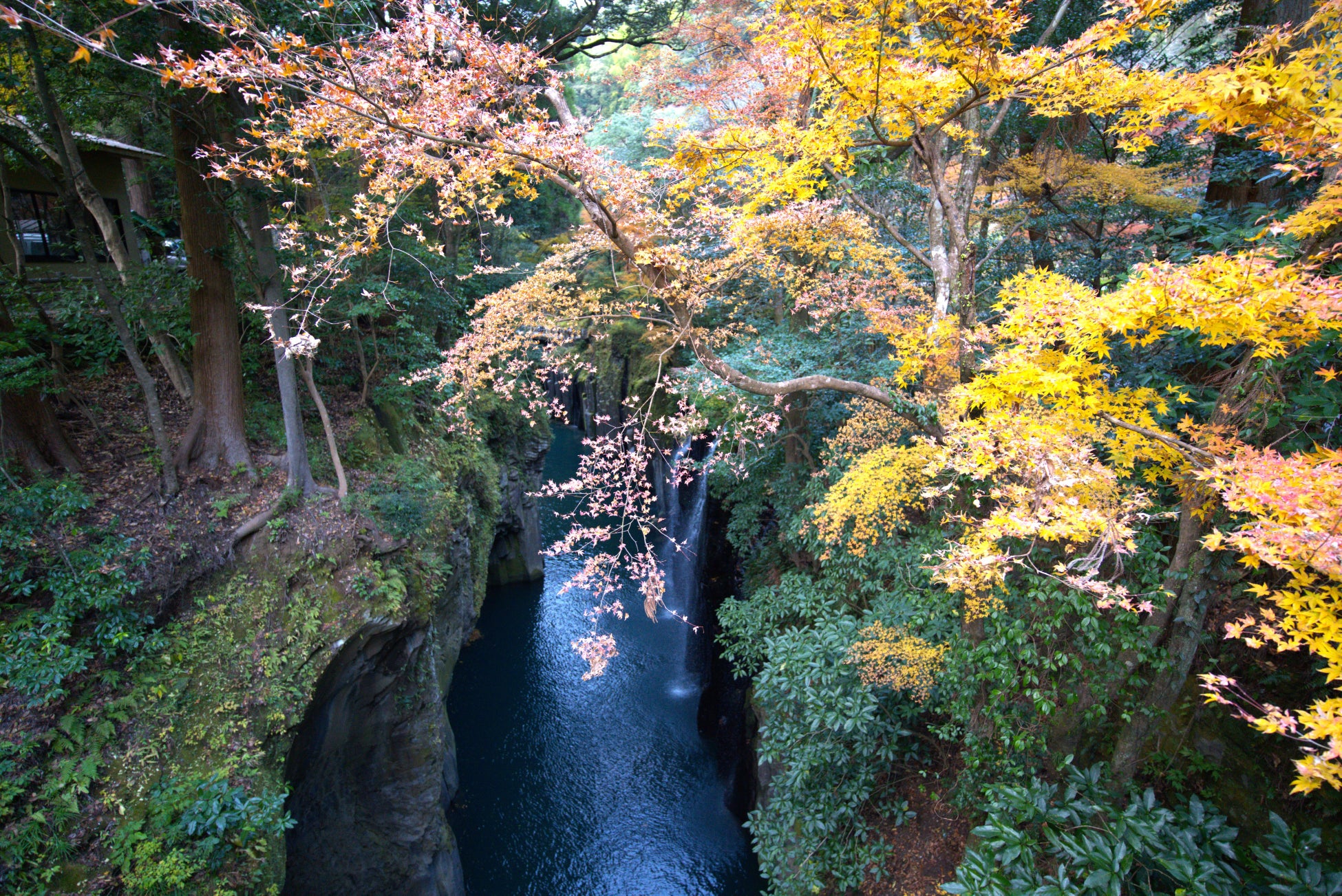 高千穂町は九州山地のほぼ中央部、宮崎県の最北端に位置し、町の中心部を五ヶ瀬川が西北から南東にかけて貫流し、途中、名勝天然記念物「高千穂峡」が神秘的かつ雄大な自然を創出しています。天の岩戸開きや天孫降臨などの神話の地としても知られています。