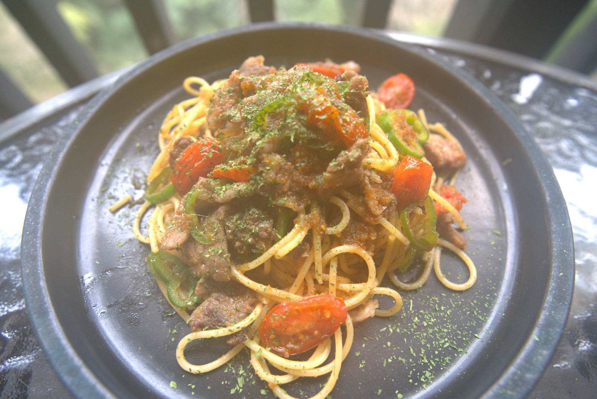 熱々の湯気とともに運ばれてきたのは、彩り豊かな「高千穂牛パスタ」。口に入れた瞬間、高千穂牛の旨みがじゅわ~っと広がります。