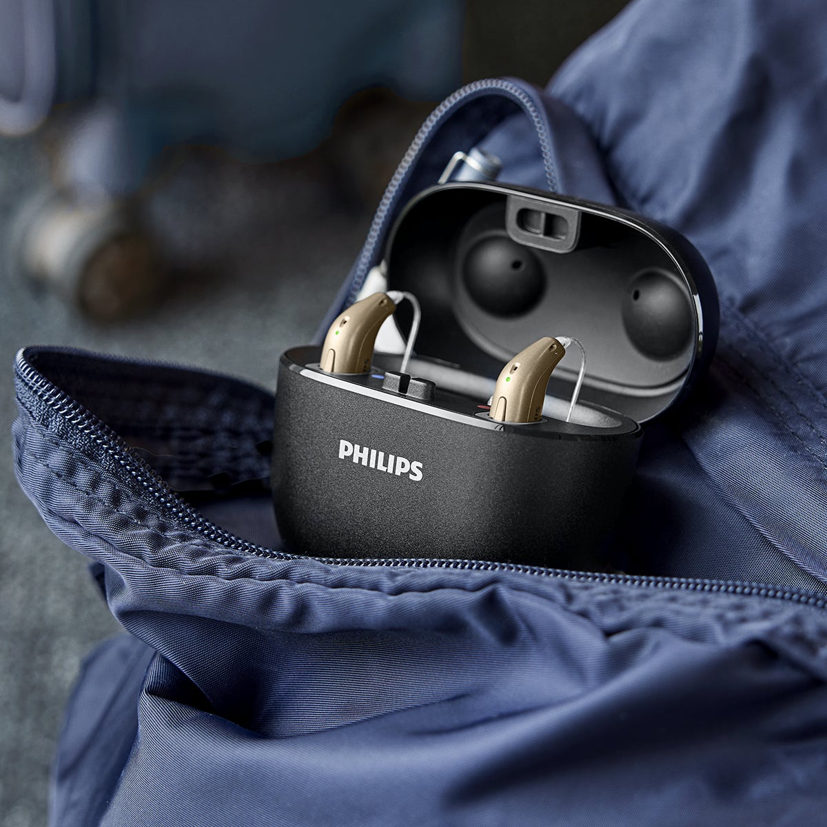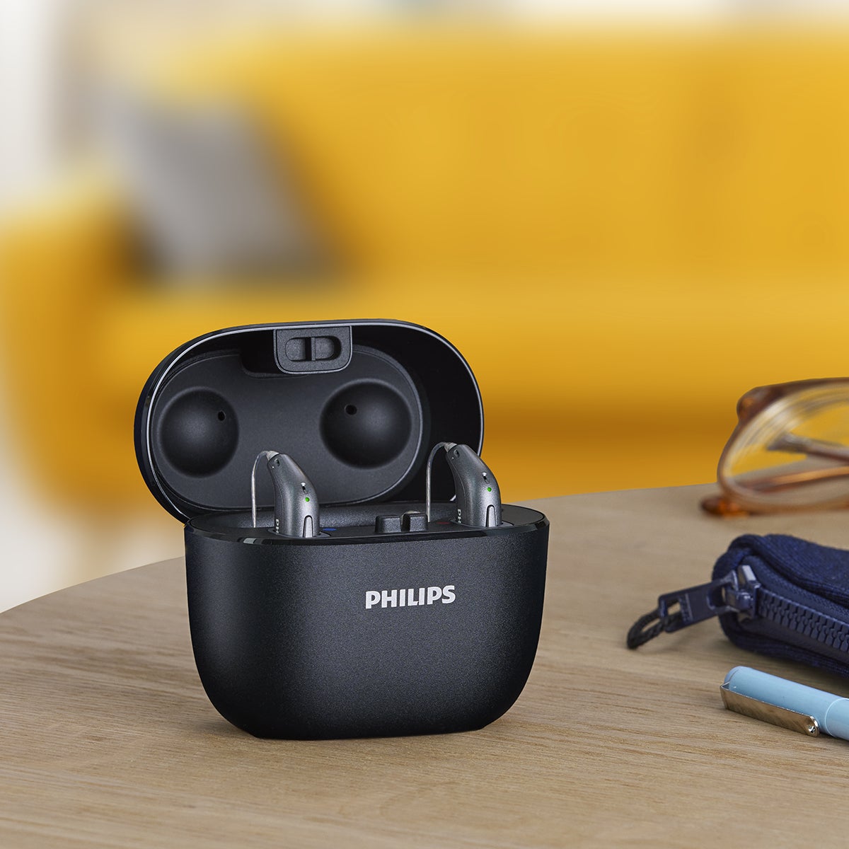 ヒアリンク 50は、ユーザー中心の設計を軸に開発されたAI搭載補聴器です。新たに搭載されたサウンドガイド機能が、ユーザーの頭や体の動きを基にどのような活動をしているかを理解し、それを補聴器の聞こえに反映させます。ヒアリンク 50に搭載された先進の AI技術とサウンドガイド※1を司るモーションセンシング技術により、ユーザーが立ち止まっていても、移動していても、周囲の環境に合わせて会話をよりクリアに聞き取ることができます。この度、ヒアリンク 50に対応した高速充電の携帯用充電器「フィリップス チャージャープラス ミニRITE」が新たに登場しました。