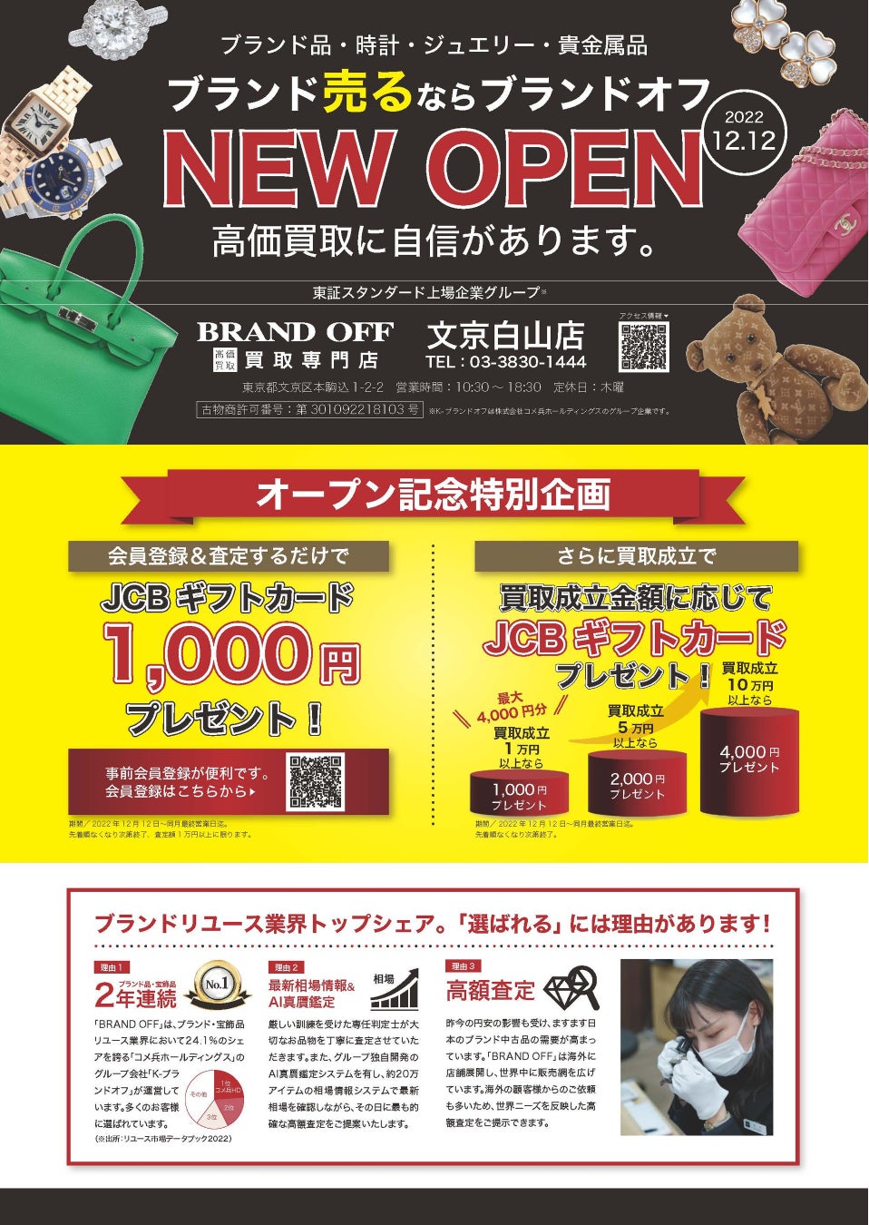 中古ブランド品のバッグ・時計・宝飾品などを扱うブランドリユースシェアNo.1(※)のコメ兵ホールディングスグループの一翼である株式会社K-ブランドオフ(石川県金沢市)は、東京都文京区にFC16店舗目となる「BRAND OFF 買取専門 文京白山店」(FC店舗)をオープンいたします。