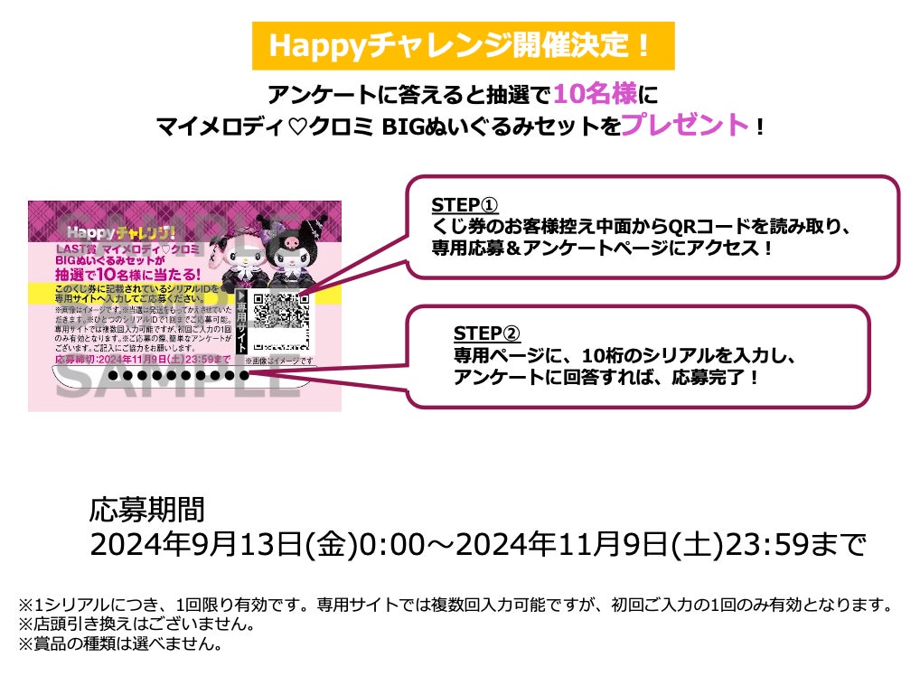 取扱い店舗情報は、Happyくじ公式ホームページ(https://www.h-kuji.com/goods/sanrio-hw2024/)をご確認ください。