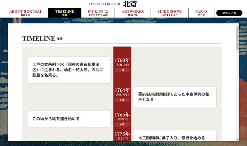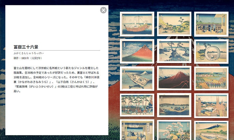 「ピックアップ10選」では、「冨嶽三十六景」「北斎漫画」「芥子」など名作といわれる北斎の作品を「作品の解説」とともに味わい、「about北斎」では、人物像に迫るエピソードから北斎の浮世絵に秘められた独創性をうかがい知ることができ、「葛飾北斎」をより深く理解することができるでしょう。