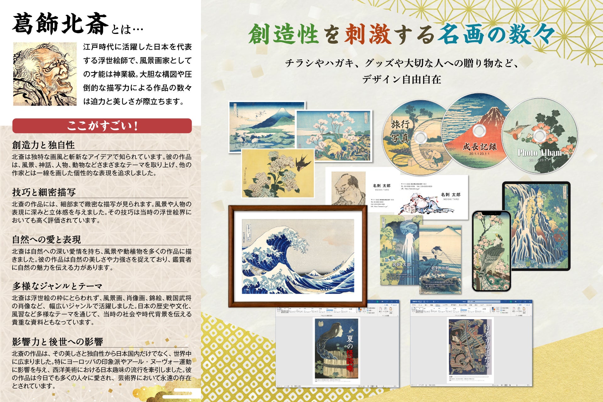 また、本製品に収録されている「全て」の北斎作品をデザイン素材としてご利用いただくことができます。