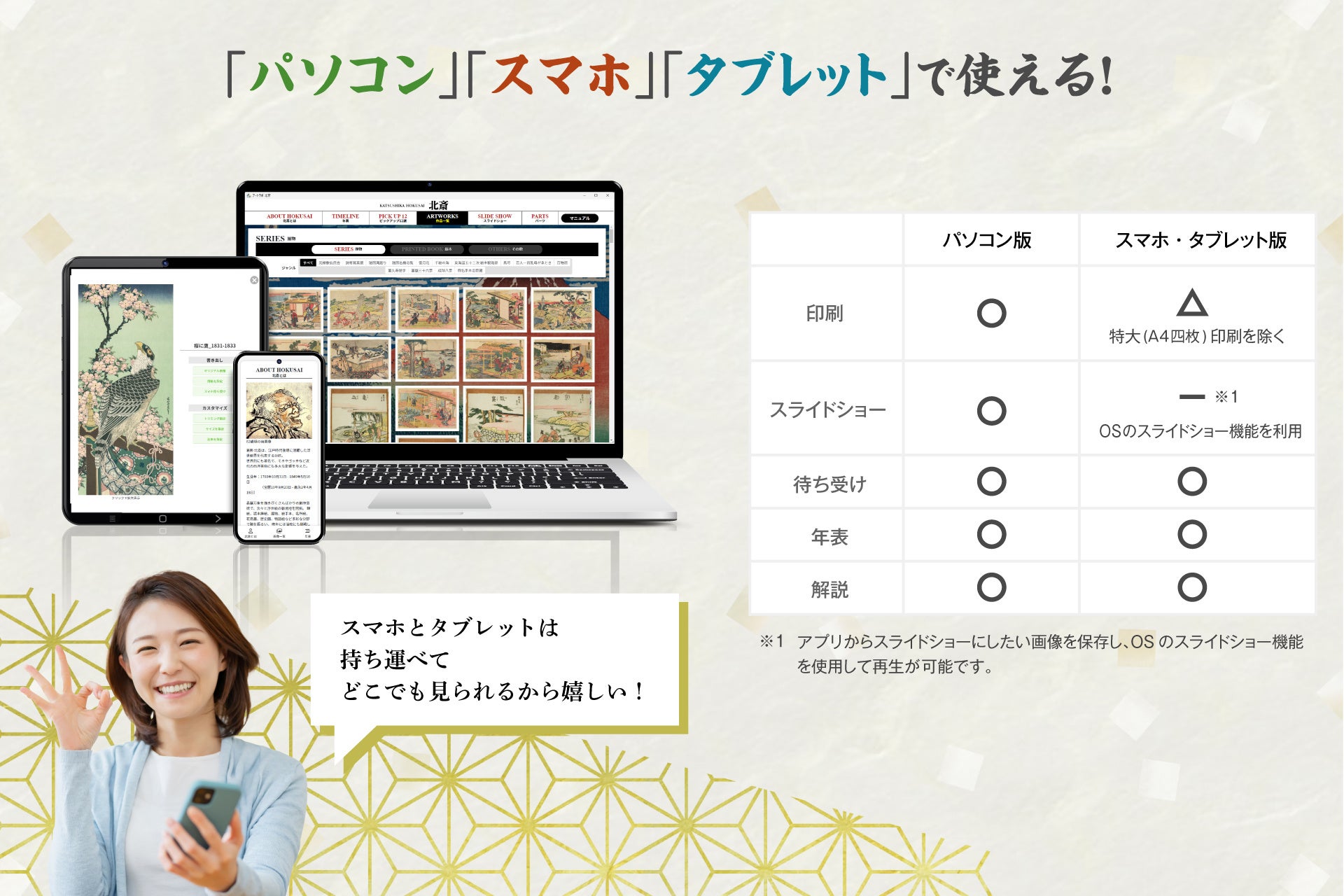 【新機能】お客様のご要望にお応えし、スマホ・タブレットでもご利用が可能に!お好きな場所に持ち運び、指先の直感的な操作で、よりインタラクティブに!いつでも簡単に北斎作品を楽しむことができます!