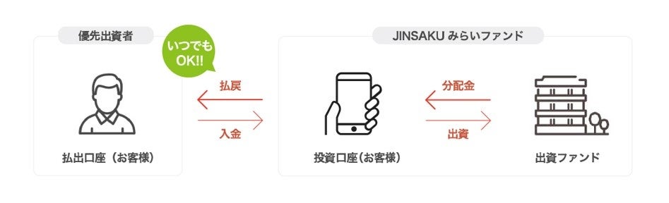 ・いつでも引き出せる投資口座預託形式お客様のマイページ内にある専用の投資口座に予め入金することで、ファンドへの出資がスムーズに行なえます。 また、未投資金(預入金)や出資配当金に関しては投資口座よりお客様の登録された払出口座へいつでも引き出すことができます。※払戻は、払戻希望額から振込手数料を差し引いた金額が振り込まれます。