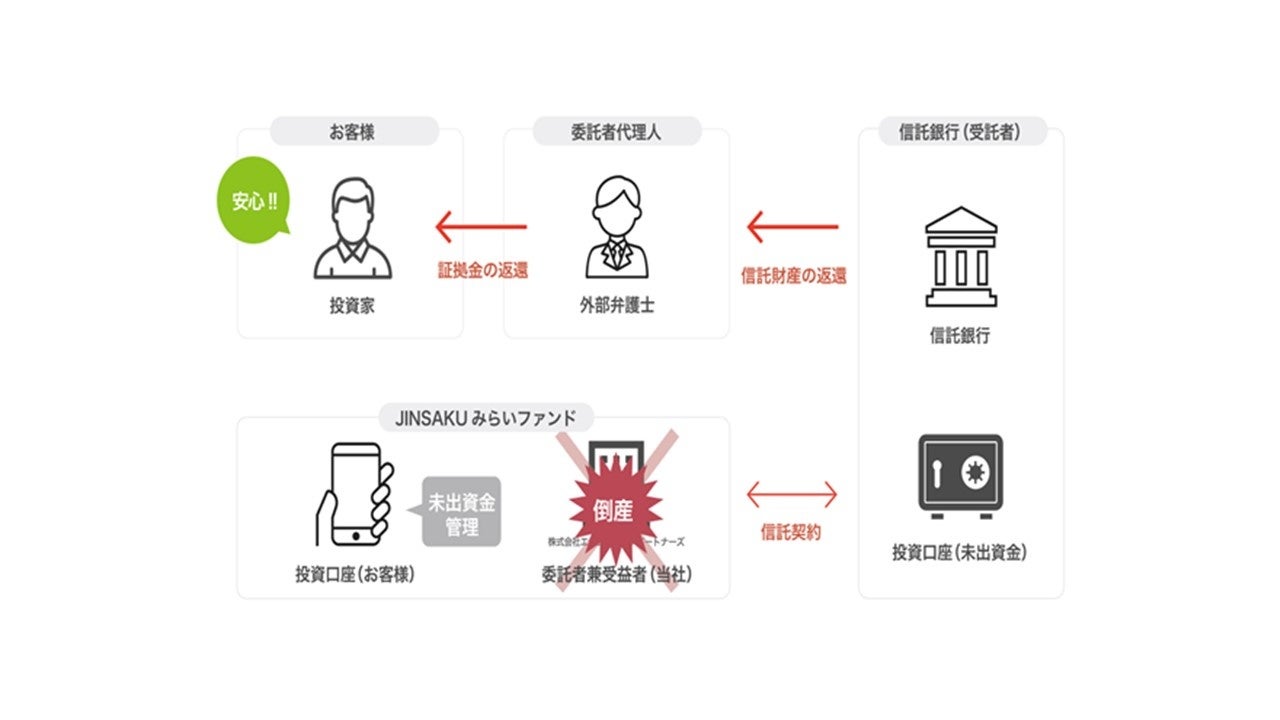 不動産特定共同事業法に基づく不動産投資商品(匿名組合型)の「JIN-SAKUみらいファンド2号」は1口10万円から投資ができ、初めて投資する方にもおすすめです。複数の投資家様(以下「お客様」という。)から出資を募り、その資金を以てJIN-SAKUみらいファンドが不動産を取得し、その賃料収入で得た利益を出資額に応じて分配するシステムです。お客様とJIN-SAKUみらいファンド間においては匿名組合契約を締結し、金銭の出資と利益の分配を約します。