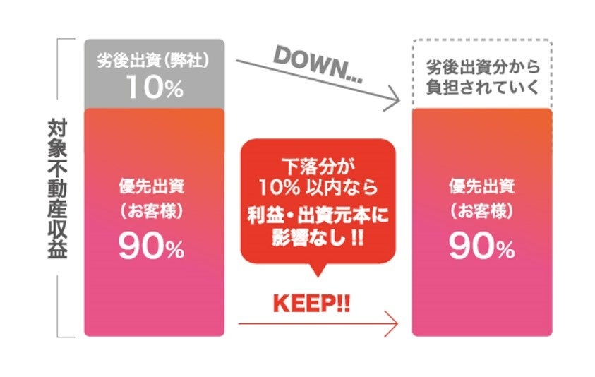 優先劣後システムを採用し、お客様の出資元本の安全を優先的に守ります。お客様に出資していただく優先出資枠は、賃貸利益の受け取り、償還時の出資金返還において、劣後出資者より優先されます。分配金は賃貸収入から物件管理運営費(税金・管理費等)を差し引いた利益が原資となります。