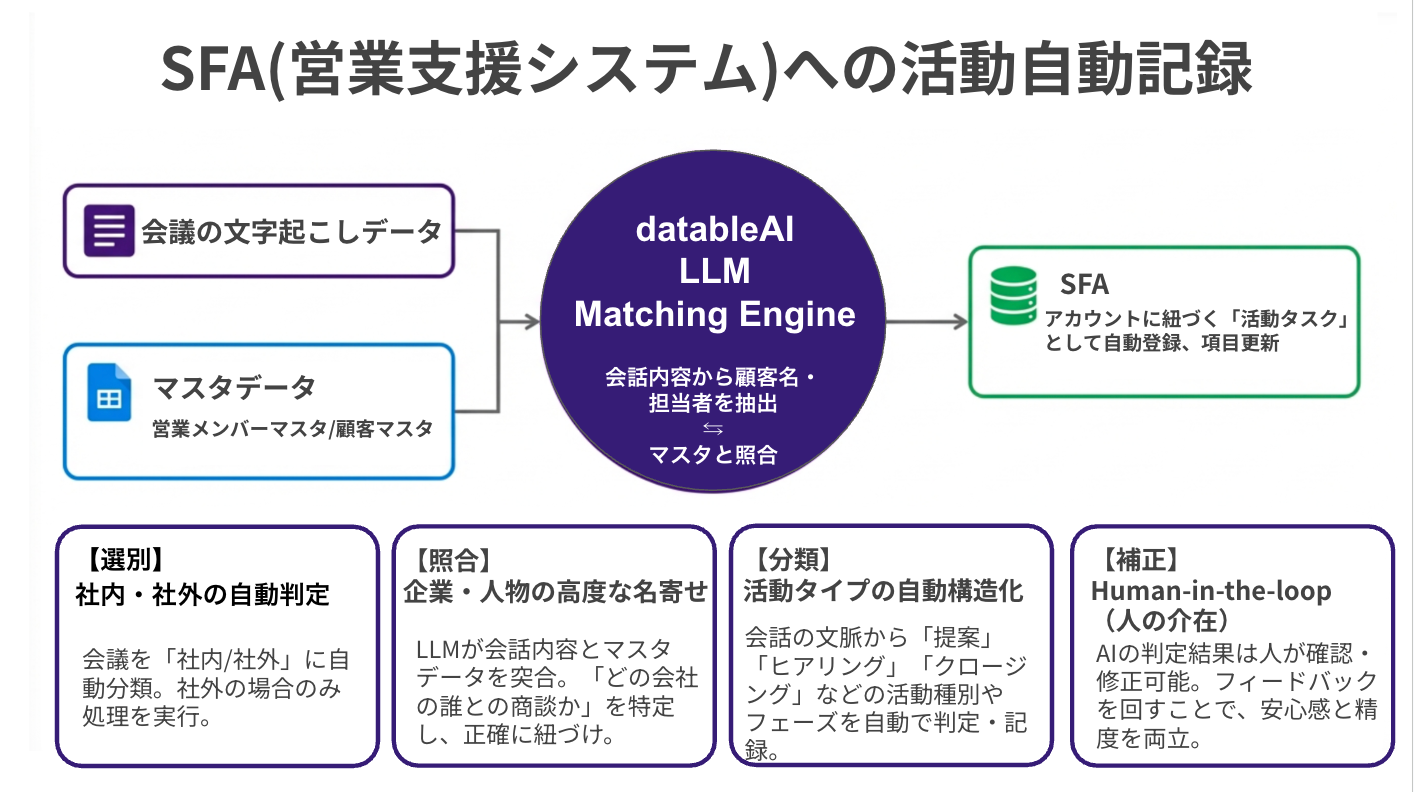 議事録作成が業務の「点」で終わり、会議後の共有・タスク化・提案準備・SFA入力が分断される問題を、“線(業務フロー)”として再設計した点が中核です。 -