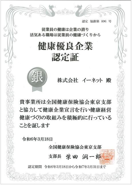 株式会社イーネット(東京都中央区/代表取締役社長:高橋 聡一郎)は、2024年3月18日付で健康保険組合連合会東京連合会より「健康優良企業 銀の認定」(認定 健銀第896号)を取得いたしました。
