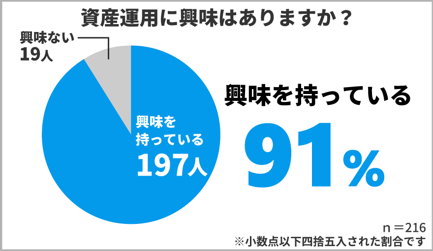 さて次にご紹介するのは、「資産運用を行っていない」と回答した216人に対するアンケート結果です。その結果によると、なんと運用をしていない方の9割が「資産運用に興味を持っている」と答えています。