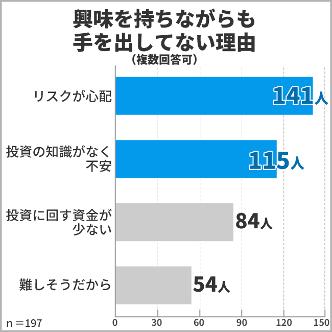 運用に興味があると答えた197人に、なぜ投資をやらないのか理由を訊ねると、回答結果の第1位は「リスクが心配」でした。そして第2位の回答が「投資の知識がなく不安」です。