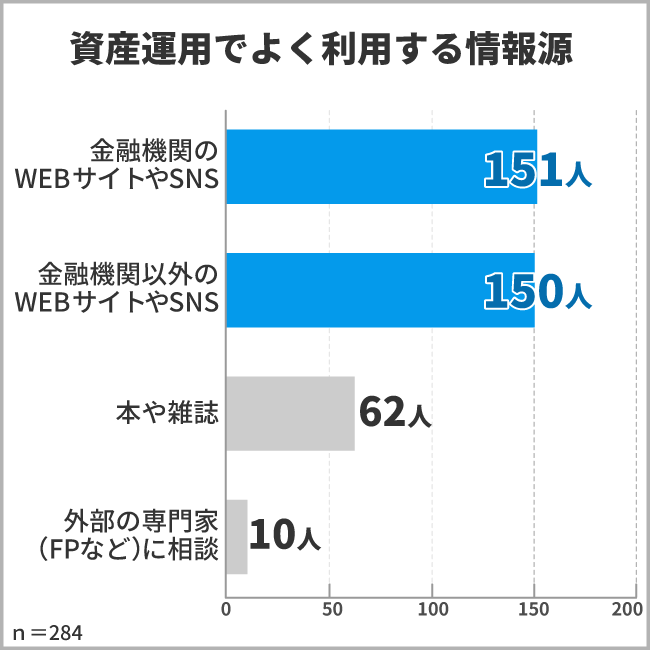 そこで「資産運用でよく利用する情報源」を訊ねてみると、金融機関もしくはそれ以外の「WEBサイトやSNS」という回答が圧倒的に多く、これだけで全回答の8割を占めていることが分かります。
