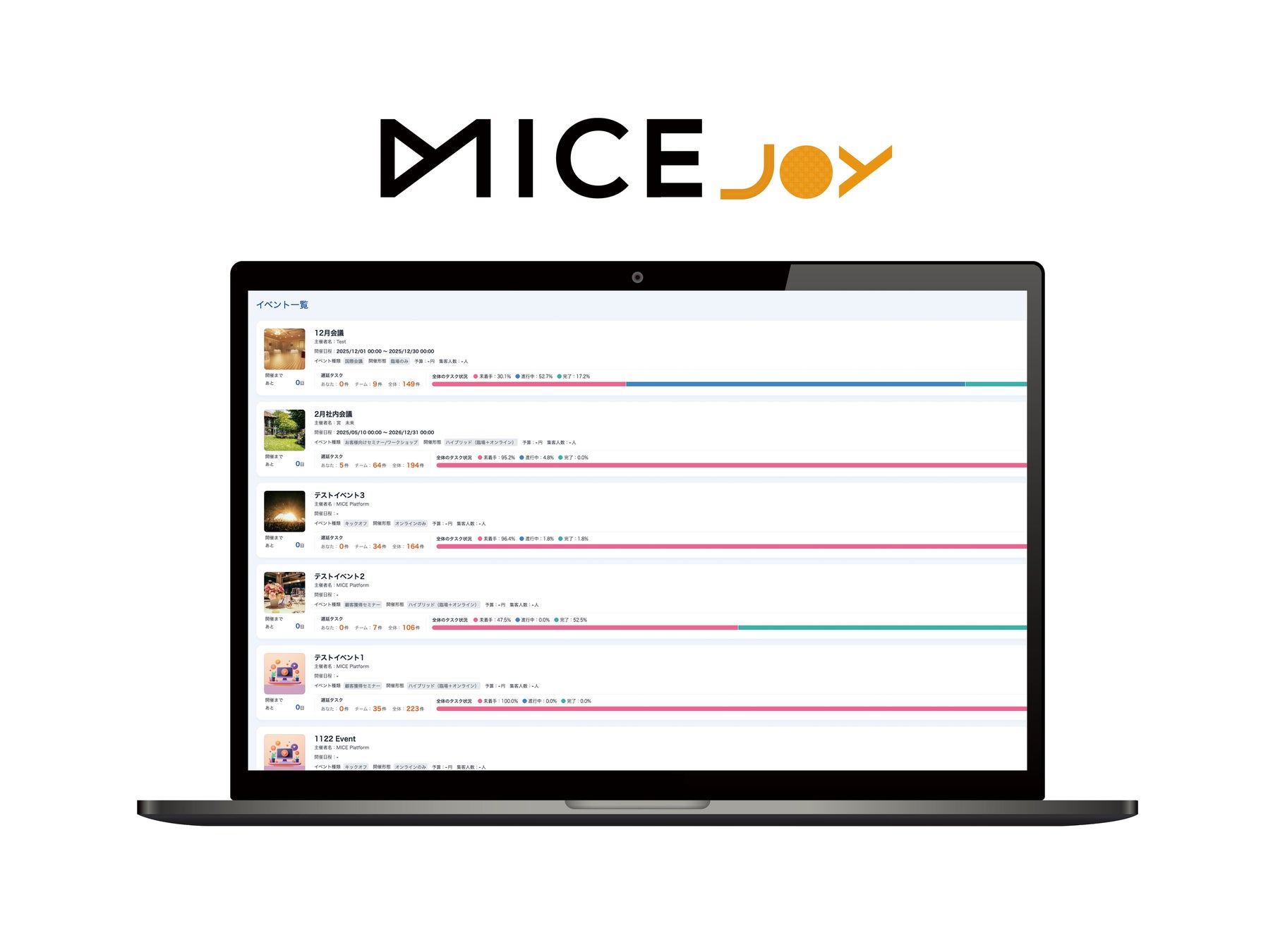 ソフトバンク株式会社のグループ会社で、MICE※業界のDX(デジタルトランスフォーメーション)を推進するMICEプラットフォーム株式会社(本社:東京都港区、代表取締役社長 兼 CEO:永田 誠、以下「MICEプラットフォーム」)は、2025年12月5日に、イベントに特化したSaaS型プロジェクト管理ツール「MICE Joy(マイス・ジョイ)」の提供を開始します。「MICE Joy」は、直感的に操作できる使いやすいUI/UXデザインが特長で、イベントの種類(入社式や株主総会、記者説明会、セミナー、表彰式など)と開催日を登録すると、タスクの一覧とスケジュールを自動生成します。タスクが遅延している場合の通知や役割に応じた権限設定などさまざまな機能により、イベント運営のプロジェクト管理を確実かつ効率的に支援します。