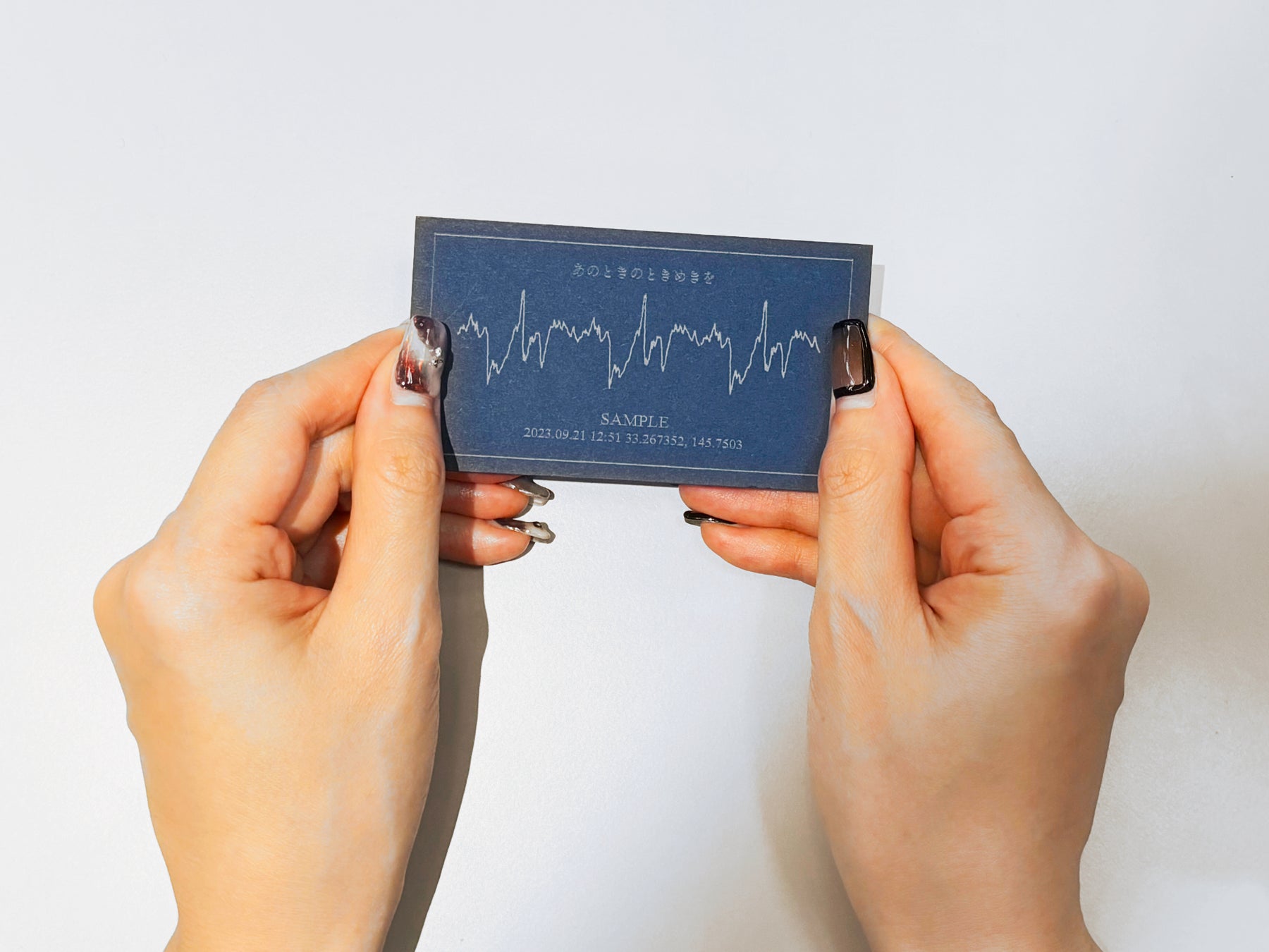 このカードは、スマートフォンのカメラを使用して脈拍を取得し、その波形をもとに美しいデザインのカードに刻印することができます。