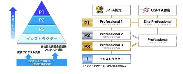 プロテストの結果後は、成績に応じて【JPTA認定プロフェッショナル1~3、インストラクター】の計4段階のライセンスに分類されます。【JPTA認定プロフェッショナル3】以上に合格された場合は、【USPTA(米国プロテニス協会)認定プロフェッショナル】ライセンスが同時に取得出来ます。
