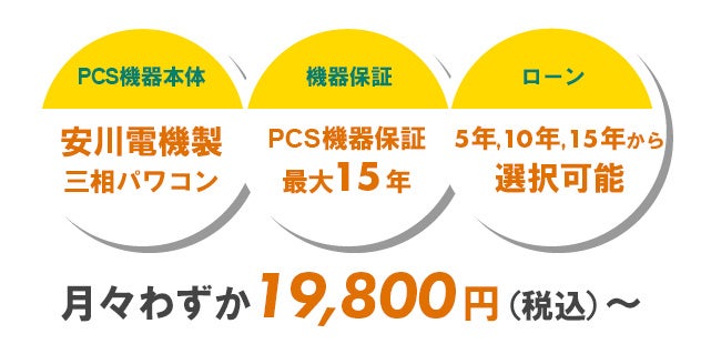 このような背景から、今回当社ではローン会社と提携することで初期費用ゼロを実現。ローン期間も最大15年で組めるため、最大15年の当社独自保証とセットにすることでFITの残存期間をカバーしながら、毎月の支払額を最小限に抑えることを可能にしました。また、PCSも撤退リスクの少ない安川電機製を採用することで、長期間安心してPCSをお使いいただけるパッケージとなっております。