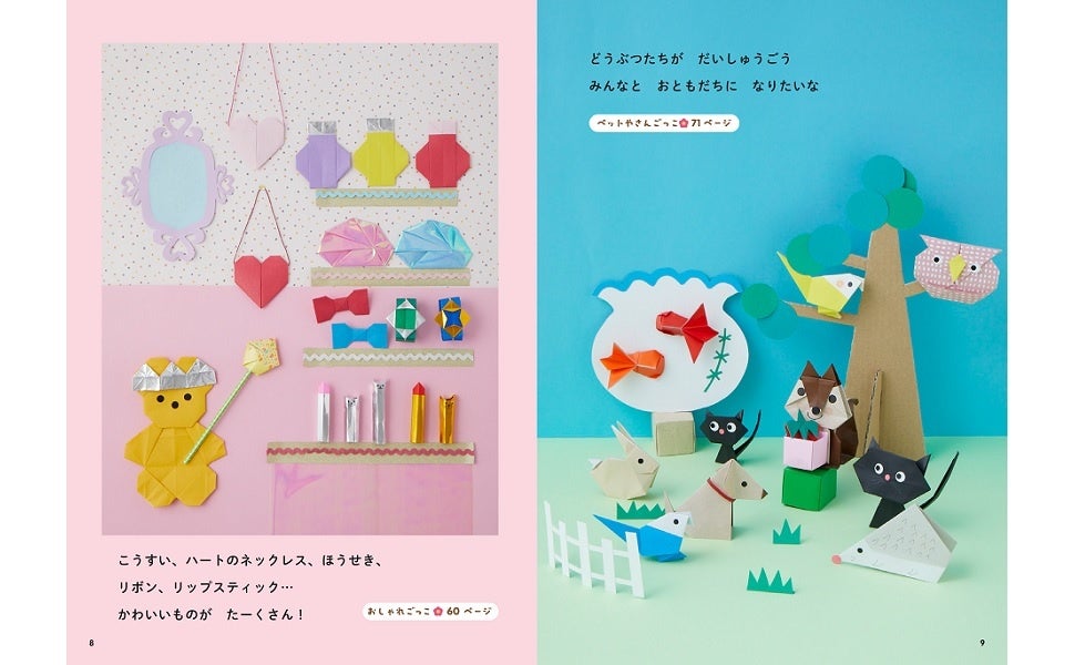 動物やお花はもちろん、野菜、フルーツ、ケーキ、恐竜、家具、バッグなど、単体で折っても楽しくてかわいいモチーフが、折った後も「ごっこあそび」で遊べる、二度楽しいおりがみの折り方が盛りだくさん。