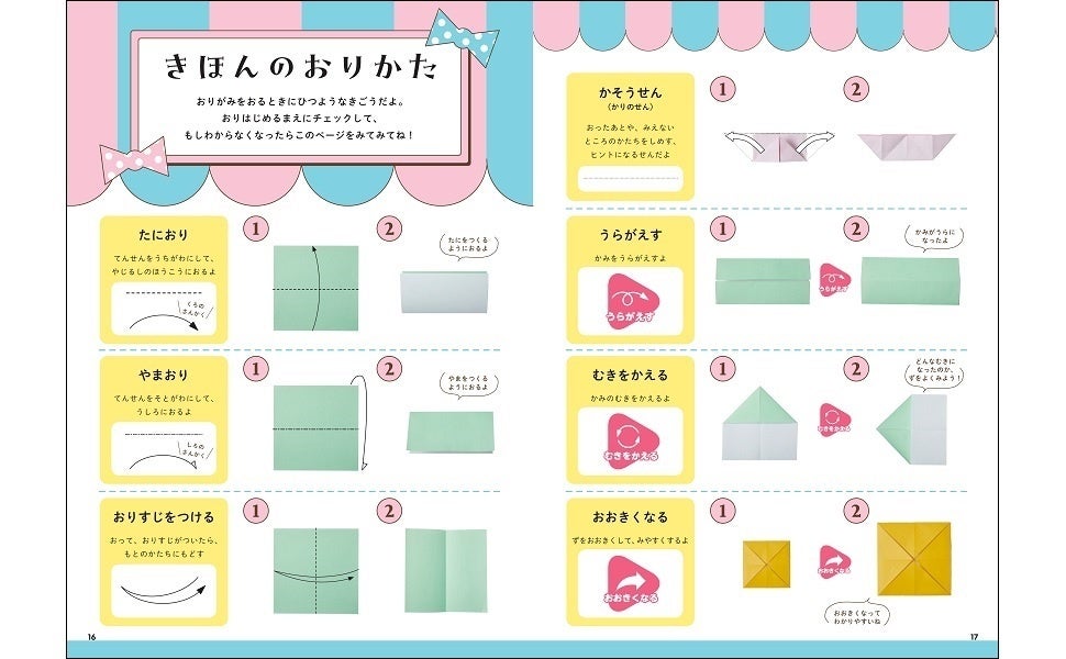 小さなお子さんでもわかりやすいように折り方を写真で解説。少しむずかしい工程も別角度からわかりやすいように写真で丁寧に掲載しています。折り方の説明は全ページひらがなで表記しています。