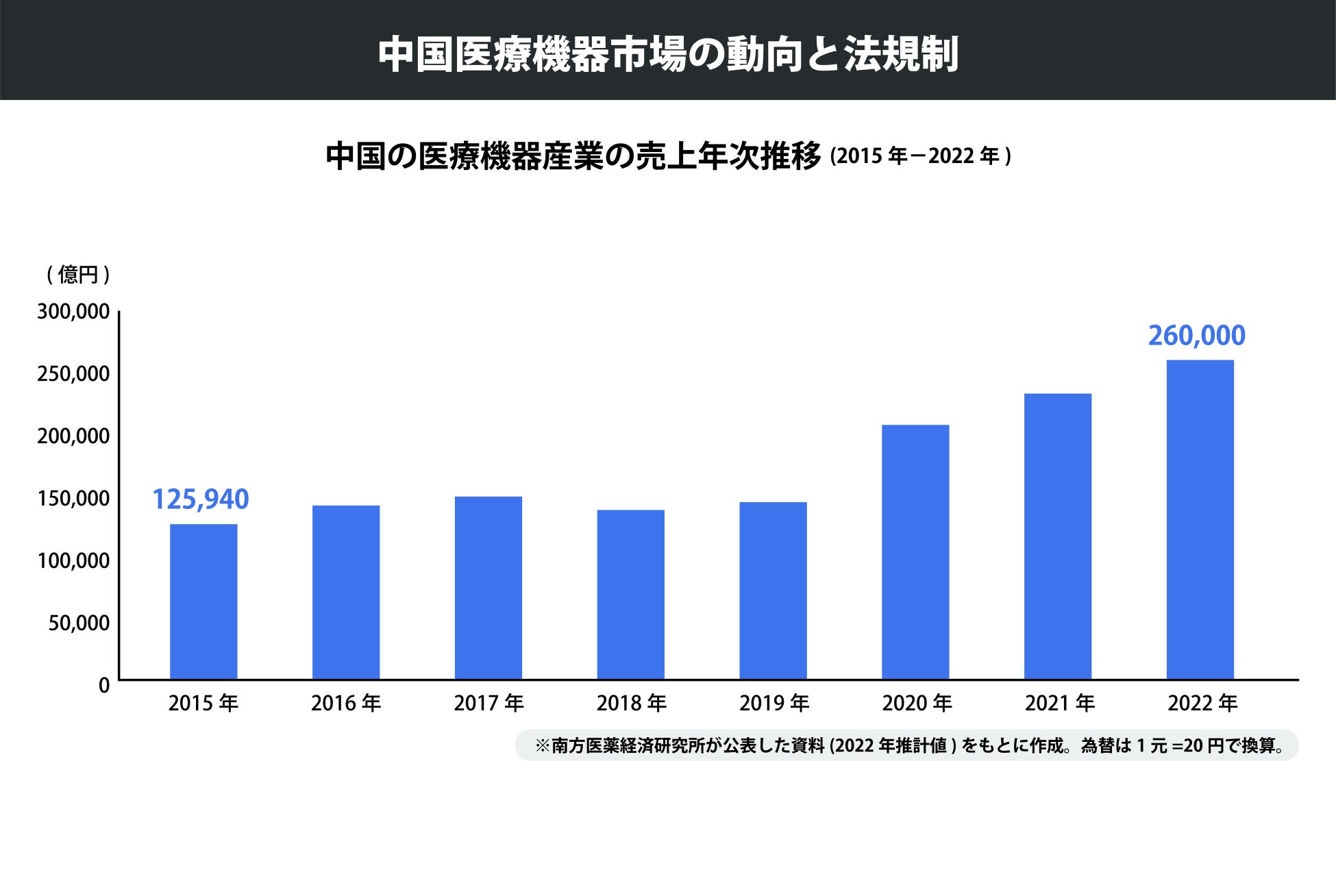 中国の医療機器市場規模は2021年に23兆円に達し、2022年は26兆円(1兆3000億元)に達する見込みです(※1)。