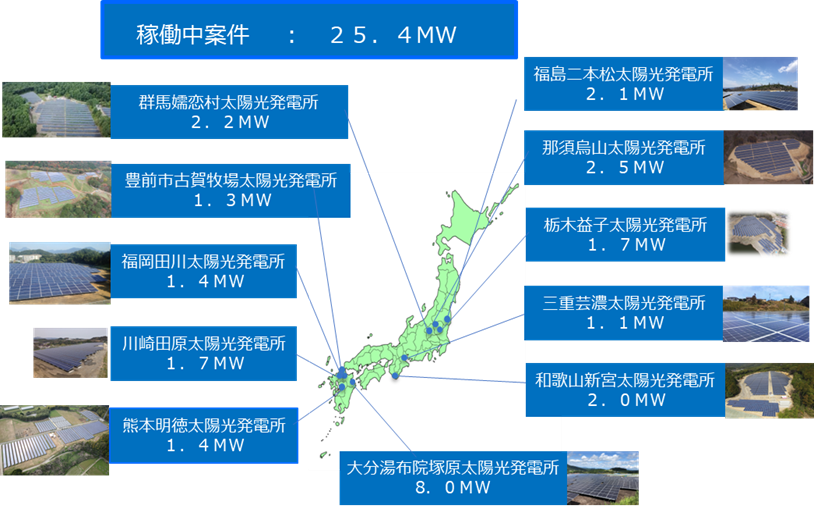 当社グループは、再生可能エネルギーの固定価格買取制度の開始を機に太陽光投資事業に参入いたしました。大分由布太陽光発電所を含めて、開発したメガソーラーは11か所、出力の合計は25.4MWに達しており、CO2削減効果は年間約10,000トンとなりました。これまでの開発実績は下記の図の通りです。