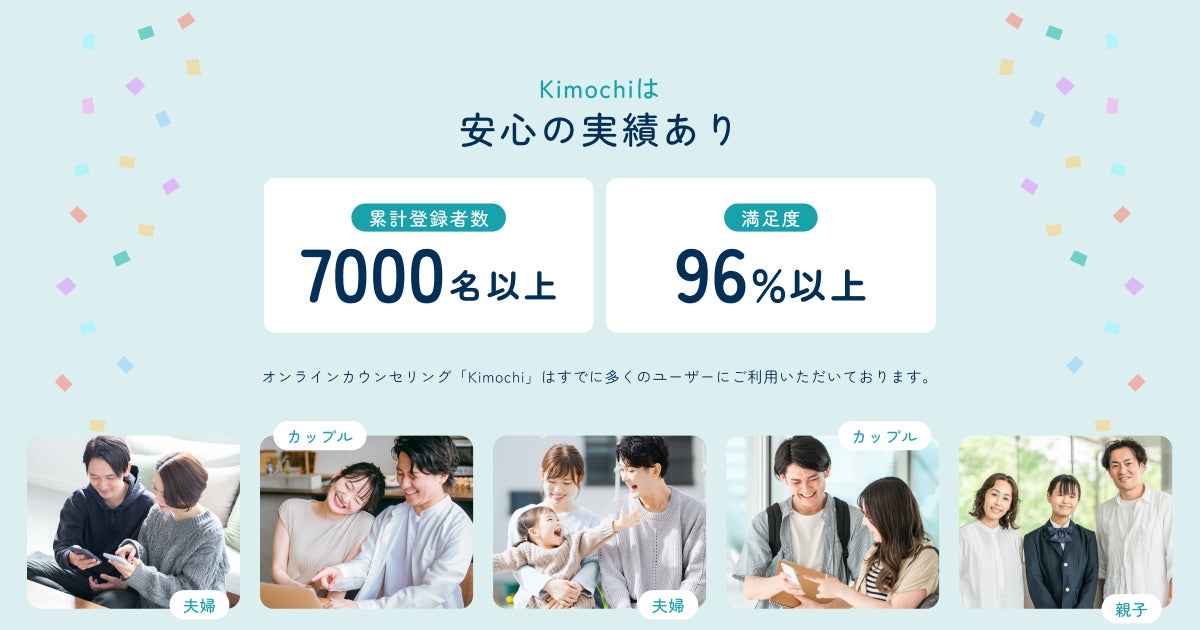 Kimochiは、これまでに7,000名以上の方にご利用いただいている信頼と実績のあるサービスです。オンライン相談が初めての方にもわかりやすいサポート体制が整っており、どなたでも安心してご利用いただけます。