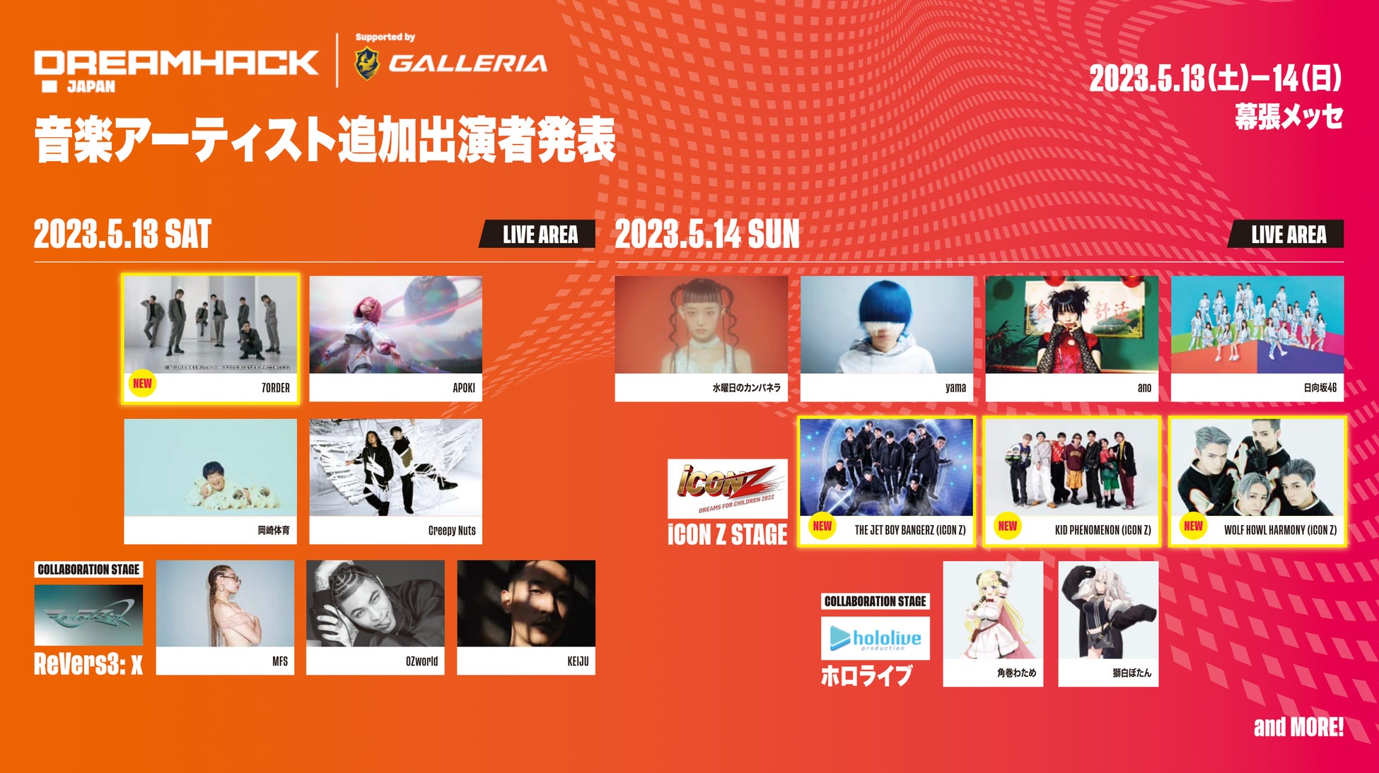 DreamHack Japan 実行委員会は、2023年5月13日(土)・14日(日)に幕張メッセで開催されるEsportsをはじめ、音楽ライブ、ゲームやアニメなどのコンテンツ、新しいプロダクトの展示などを複合的に展開するエンタテインメントゲーミング・フェス「DreamHack Japan 2023 Supported by GALLERIA」にて、新たに第6弾となるゲームステージ企画、出演アーティスト、およびBYOCエリアの企画情報を解禁します。