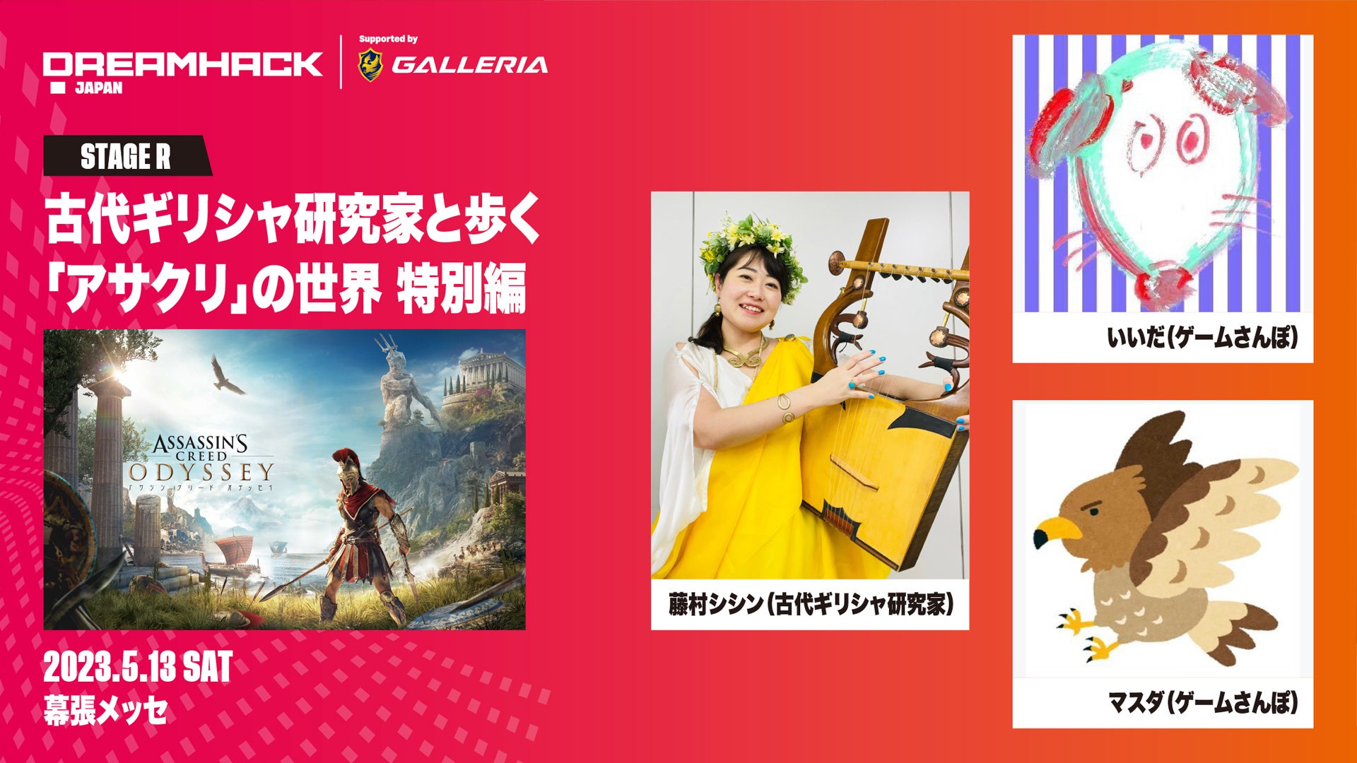 今回は「ゲームさんぽ」でお馴染みの藤村シシン氏(古代ギリシャ研究家)、いいだ氏 (ゲームさんぽ)、マスダ氏 (ゲームさんぽ)の3名をお迎えして、人気シリーズ『古代ギリシャ研究家と歩く「アサクリ」の世界』の特別編を、DreamHack Japan Presented by GALLERIAのSTAGE Rにて開催いたします。2000年の時を越え、古代ギリシャ人たちの"生き様"を目撃しましょう。