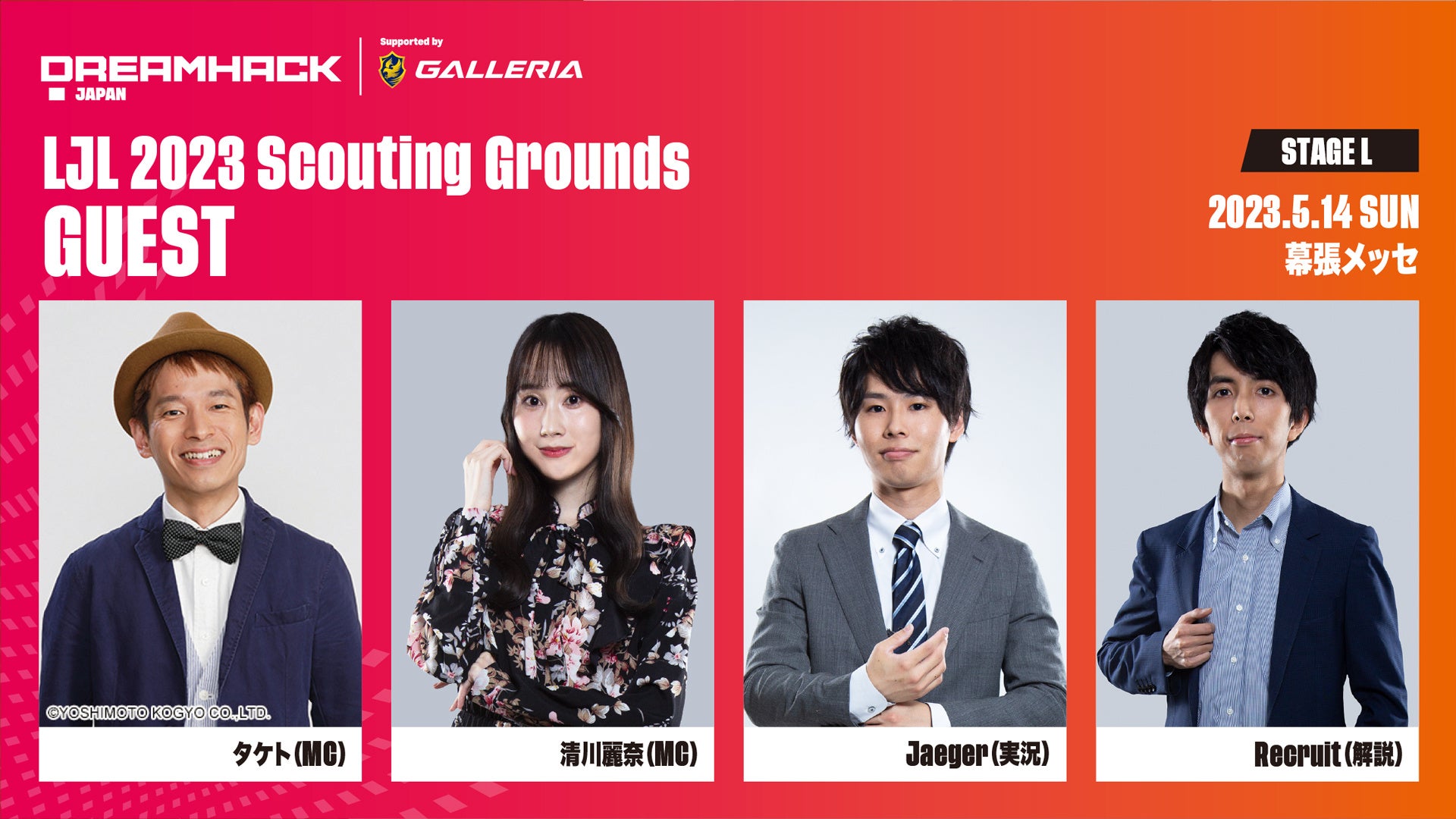 5月14日にSTAGE Lにて開催予定の「LJL 2023 SCOUTING GROUNDS」オフライン決勝の出演ゲストが決定しました。LoLの日本公式プロリーグLJL (League of Legends Japan League)の実況・解説でおなじみのJaegerさんとRecruitさんのほか、MCにタケトさん、清川麗奈さんをお招きして決勝を盛り上げます。