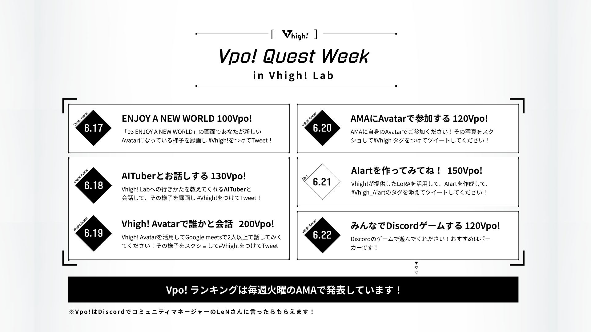 Vpo! Questが毎週発表され、それを満たせばVpo!を獲得できます。Vhigh! Avatarを活用するQuestもあるので、Vhigh! NFT Gen 1.0をSOULBINDし、Vhigh! Avatarを手に入れてから参加することをおすすめします。