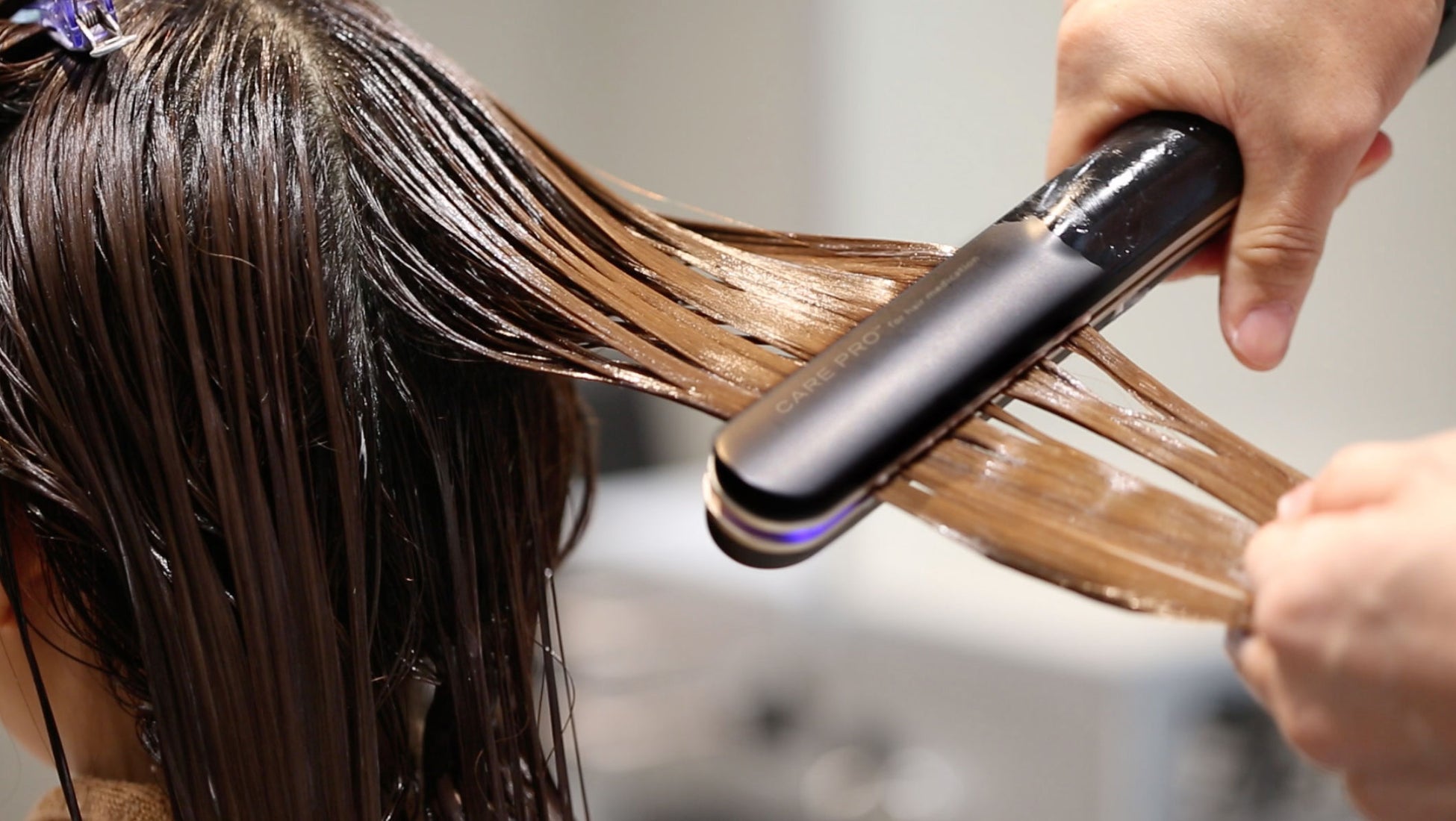 2017年11月に全国のヘアサロン向けに業務用として販売を開始した、トリートメント浸透促進用 超音波アイロン「CARE PRO」(現行品名:CARE PRO professional)。