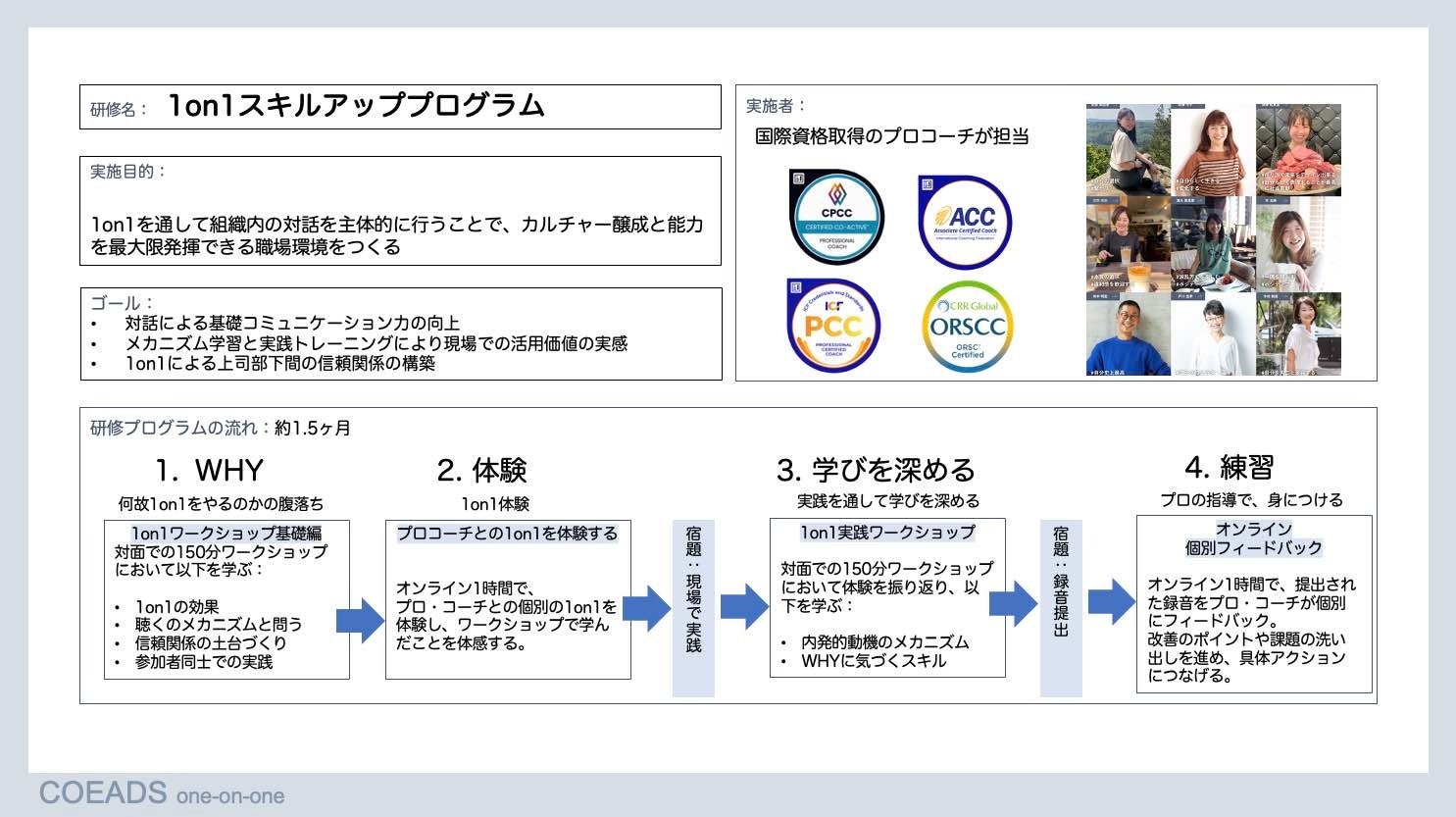 日本の企業の約7割が1on1ミーティングを実施していると言われていますが、実態は「思うように機能しない」「上司にも部下にも余計な負荷になっている」「定着しない」など多くの企業は問題を抱えています。そこで、COEDASはコーチングスキルを活用した管理職向けの1on1スキルアップのプログラムを開発しました。