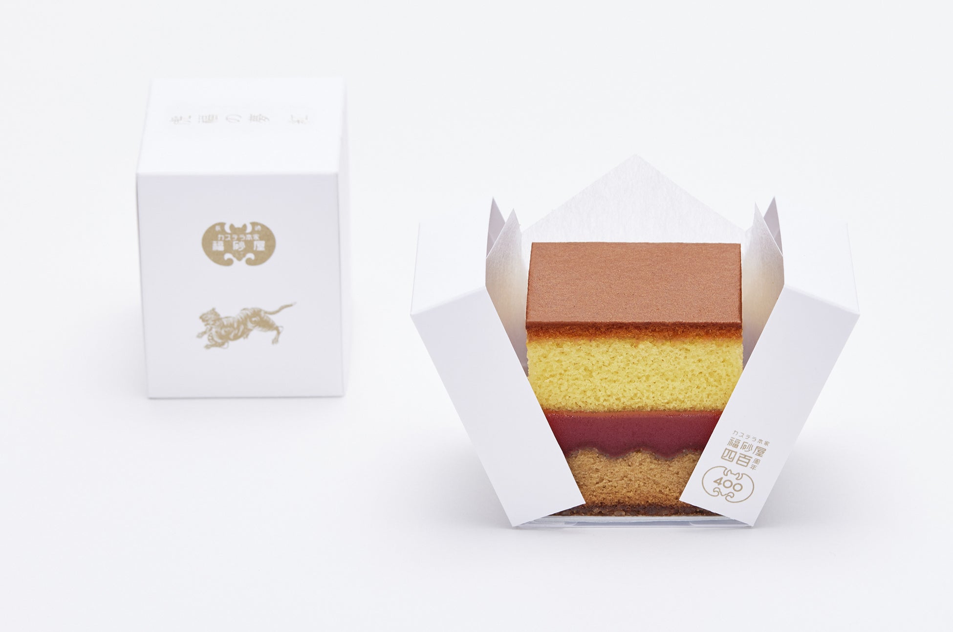 上段は福砂屋のカステラ、中段は紅色が美しいとらやの煉羊羹(ねりようかん)、下段はカステラの材料にとらやのさらし餡を混ぜたオリジナルの生地で構成し、これらを一緒に焼き上げることで美味しさが一体となり、とらやの餡と福砂屋のカステラの味わいを一度にご堪能いただけます。とらやの手提げ袋でお馴染みの「虎」と、福砂屋のロゴで親しまれている「蝙蝠」をあしらった特別なパッケージでお届けします。