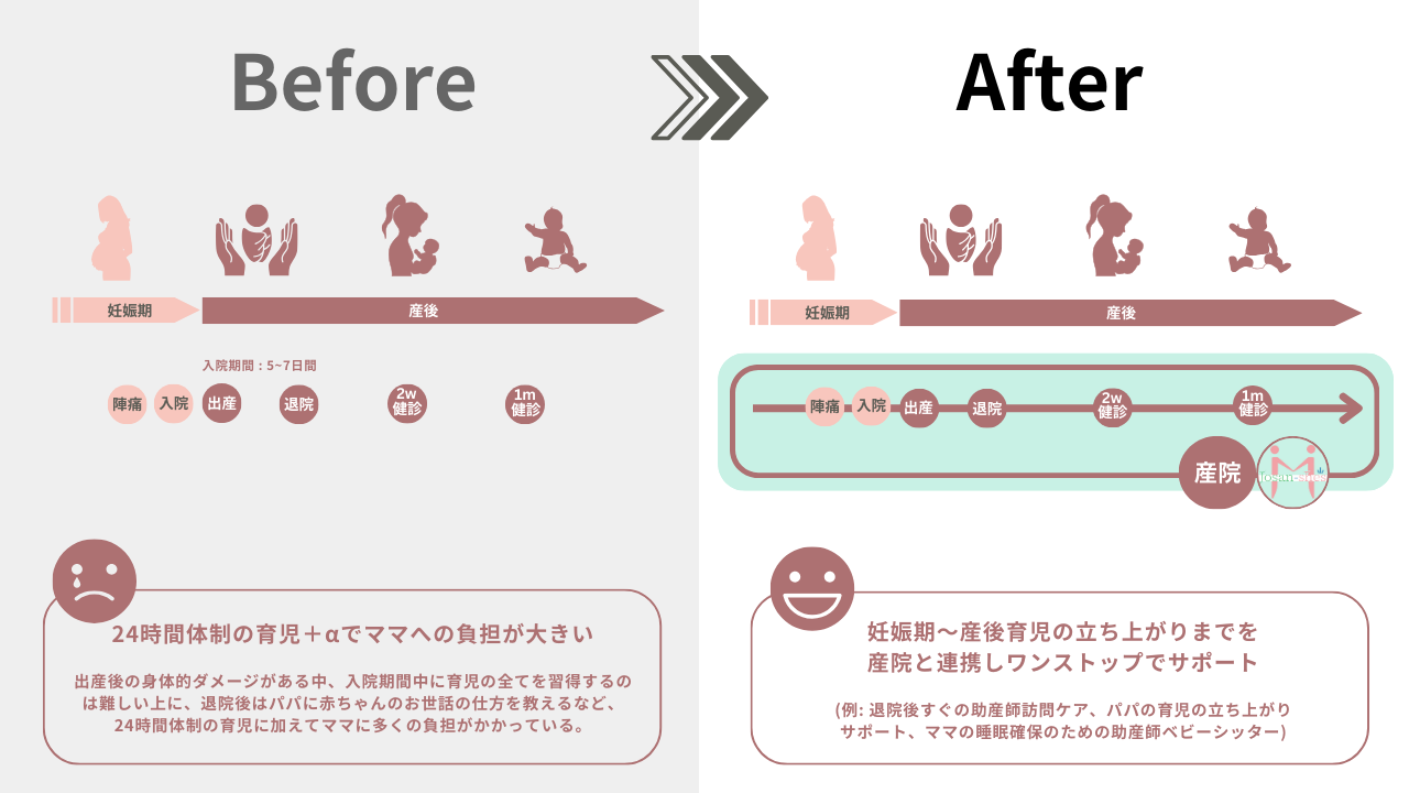 約6万人の潜在助産師の新たな活躍の場をつくり、産前から退院後も育児のサポートを提供することで、世の中の子育て課題の解決をします。