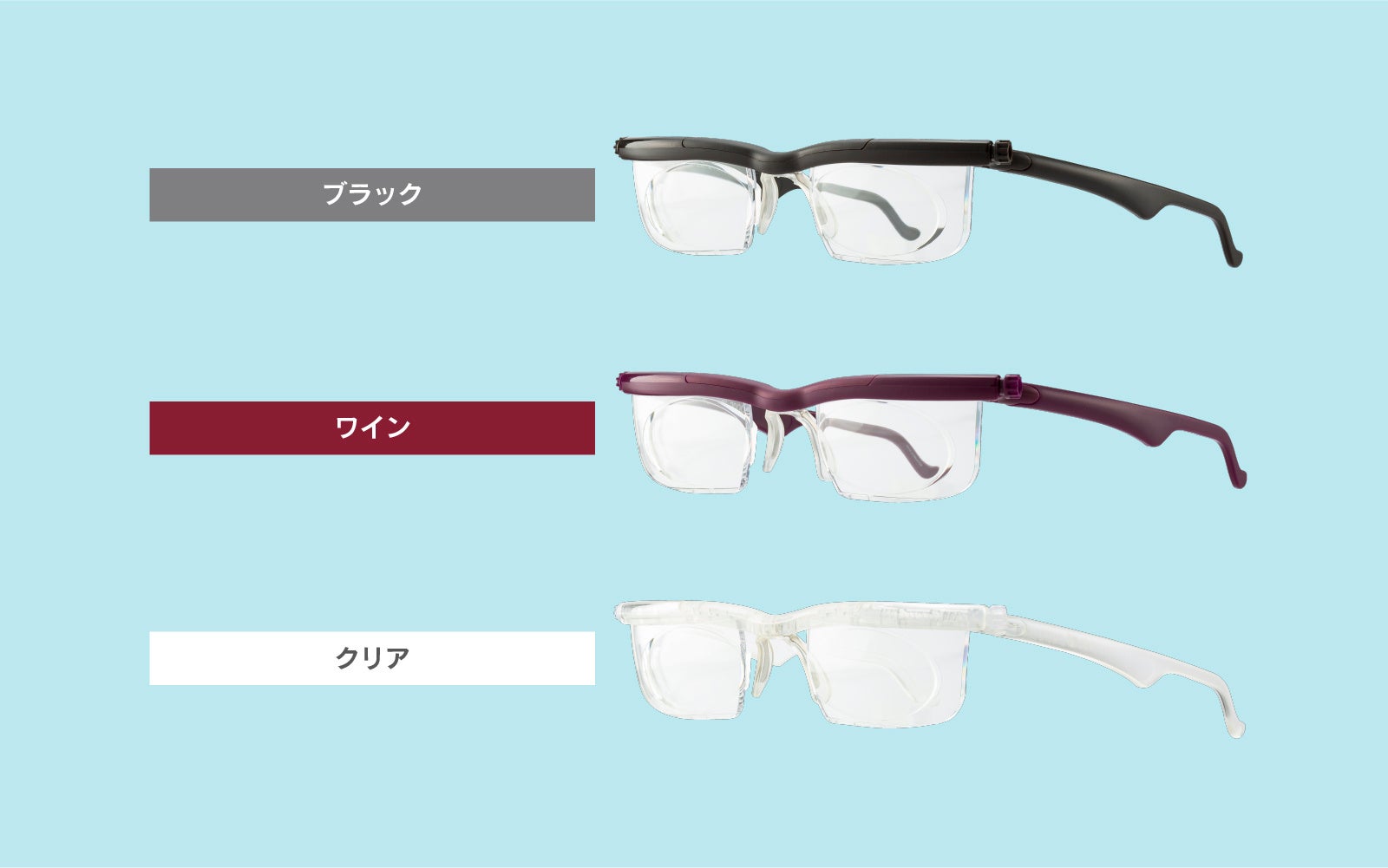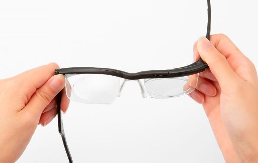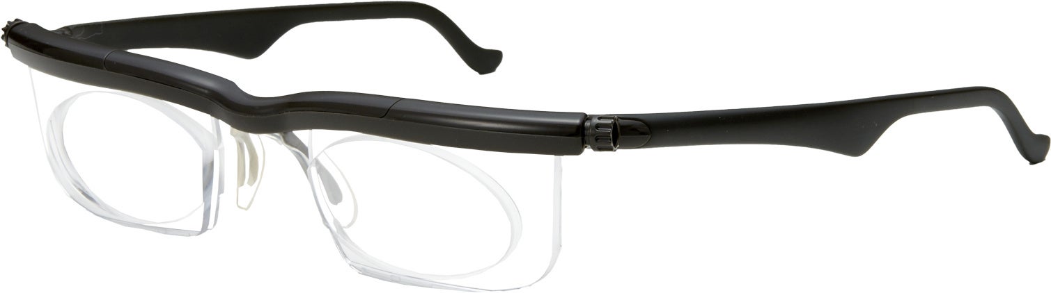 その特長は、レンズの左右についているつまみを回すことで度数調節が可能な点にあります。この機能により、一つのメガネで多岐にわたる視力の調節が可能となり、1つのメガネで複数の度数に対応でき、緊急時に素早く対応することができます。