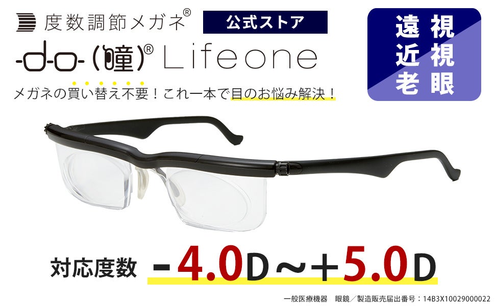 ドゥーライフワンは、1本で近視、遠視、老眼鏡に対応した、災害時に頼りになるメガネです。