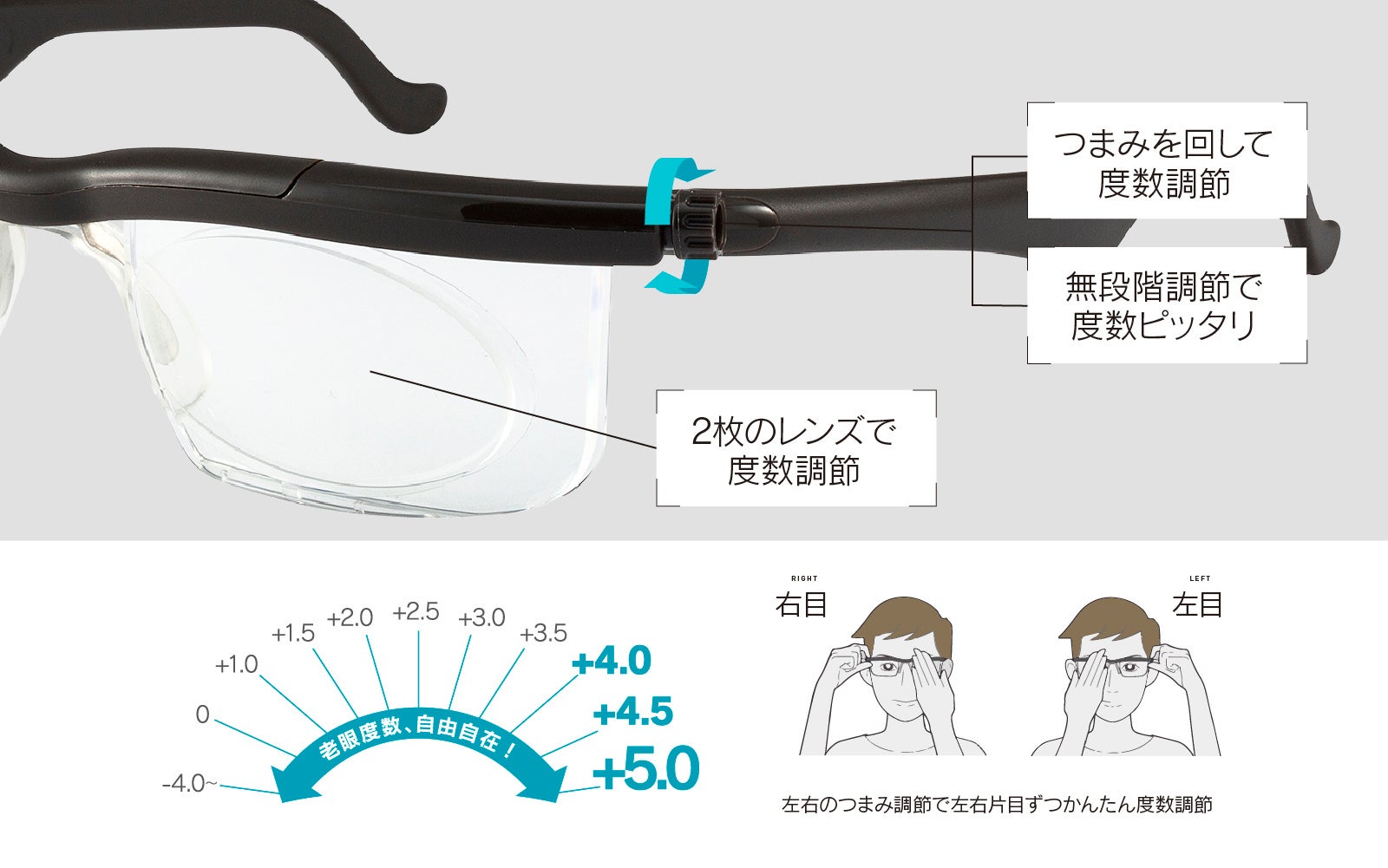 ドゥーライフワンは1本で近視・遠視・老眼に対応可能。左右のレンズにあるつまみを回すだけで-4.0D〜+5.0Dで度数調節ができます。