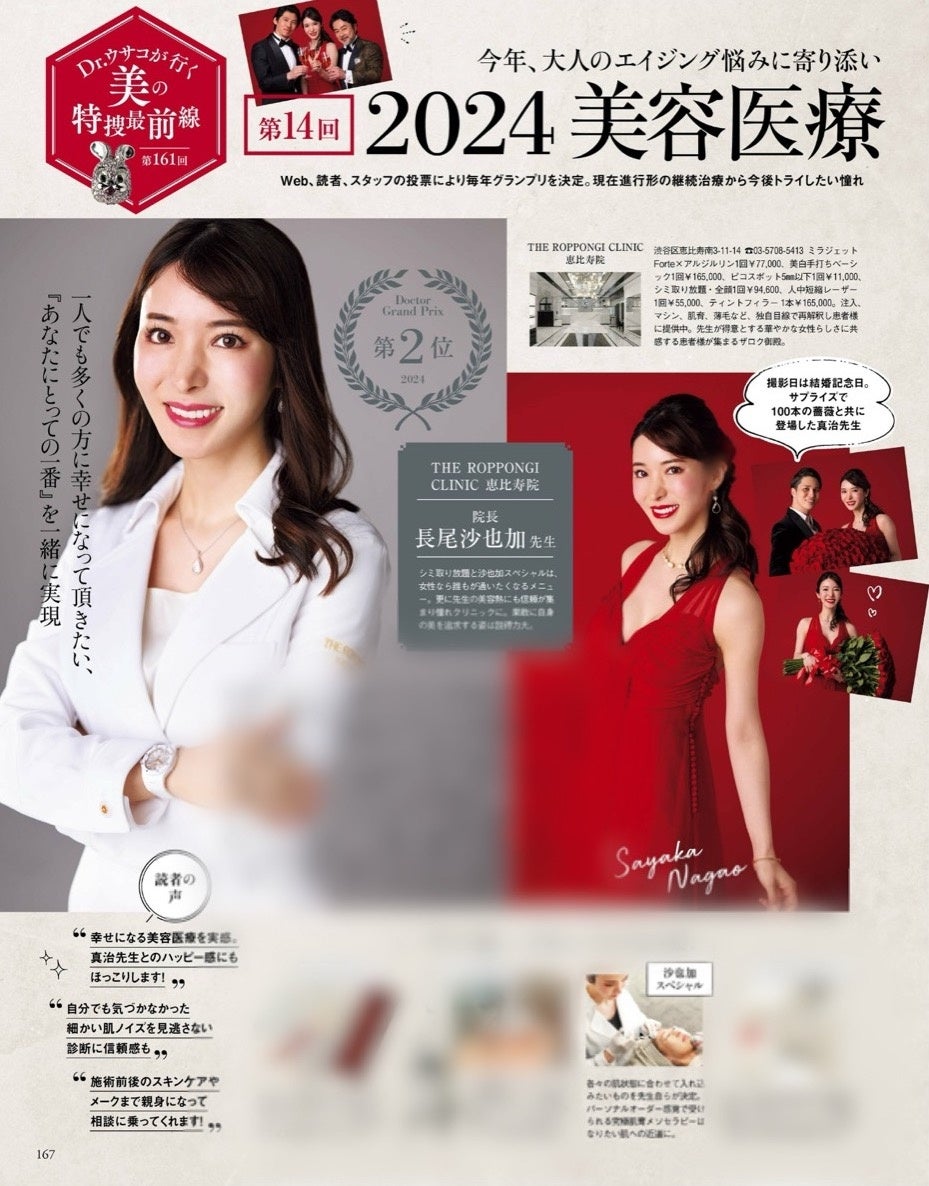 この度、株式会社光文社の美容雑誌「美ST」が主催する『美容医療ドクターグランプリ 2024』において、THE ROPPONGI CLINIC(ザ・ロッポンギ・クリニック)院長・長尾 沙也加が第2位を受賞いたしました。