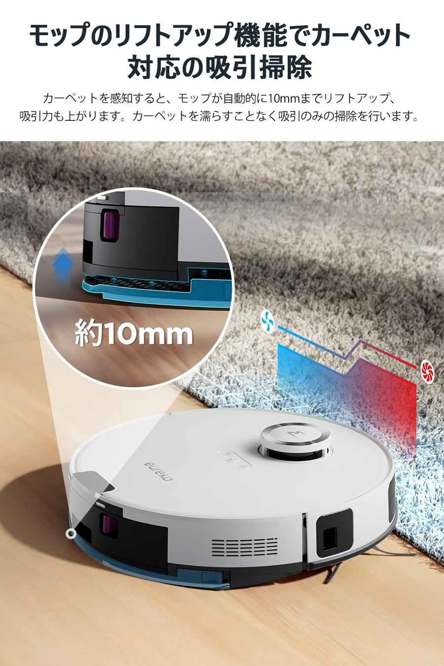 Eureka E10sロボット掃除機はレーザーとPSDセンサーを搭載しており、カーペットを自動検知します。