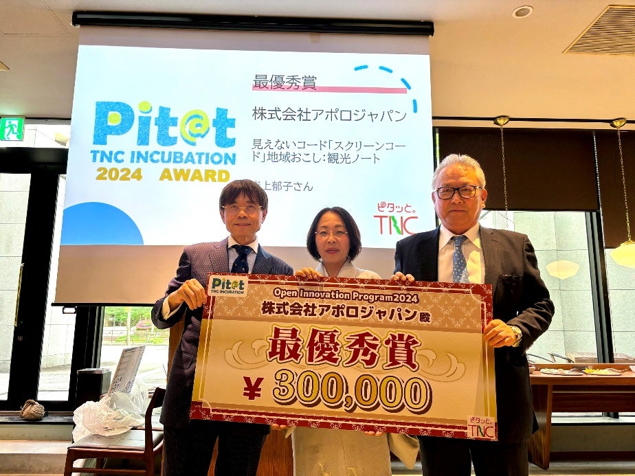 本プログラムには88件の応募があり、一次選考(書類審査)を通過した7組のファイナリストが最終選考会に臨み、プレゼンテーションを行いました。選考の結果、最優秀賞は、目に見えないコード(スクリーンコード)を生かした地域おこしのアイデアを発表した株式会社アポロジャパン(本社:福岡県北九州市、代表取締役社長CEO:岸上郁子)が受賞しました。このほか以下の通り、優秀賞と審査員特別賞を選出しました。