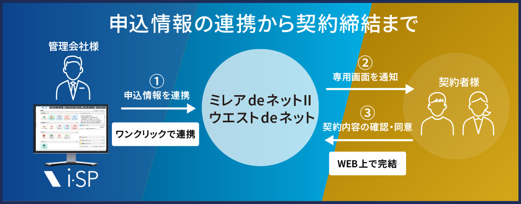 この度、賃貸管理システムi-SPとミレアdeネットⅡ、ウエストdeネットが連携することで、i-SPから申込情報をタイムリーに連携。契約者様へ専用画面を案内しWEB上で契約内容の確認・締結が行えます。申込・契約手続きの業務効率化が行えるため、管理会社様及び契約者様双方にメリットがあるサービスとなっています。