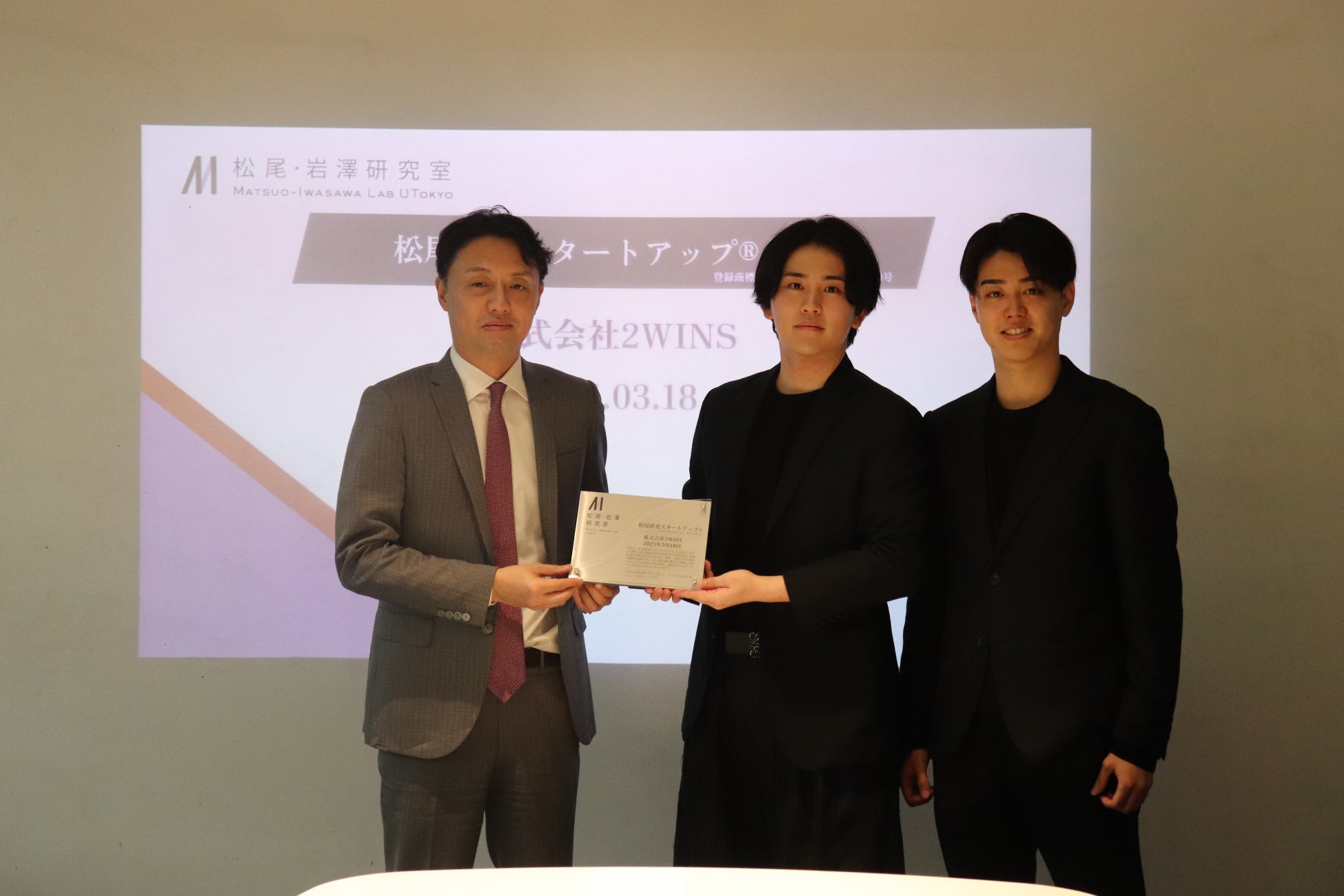 東京大学発のAIベンチャー企業である株式会社2WINS(本社:東京都渋谷区、代表取締役Co-CEO:小川椋徹 / 吉村良太、以下「2WINS」)は、この度、東京大学「松尾研発スタートアップ®」に認定されました。これを受け、2025年3月18日(火)に東京大学工学部2号館にて、認定式が執り行われました。