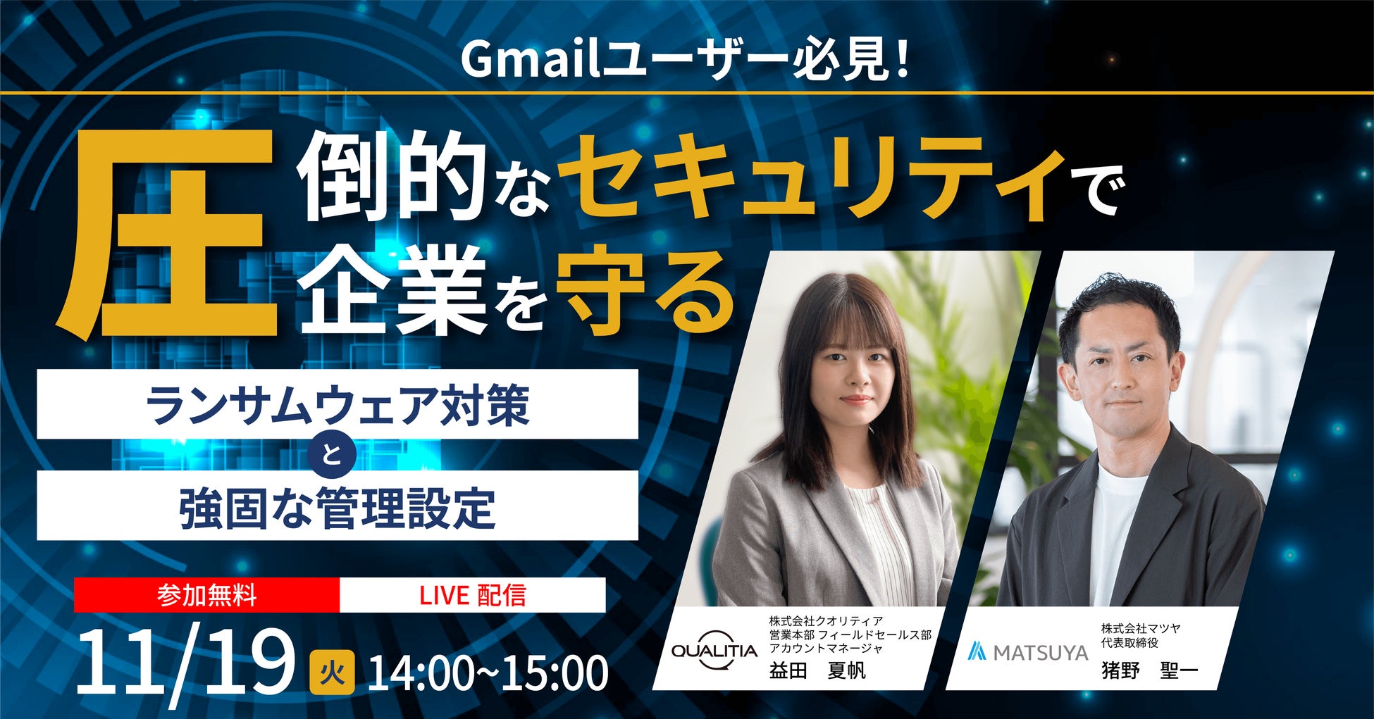 株式会社クオリティア(本社:東京都中央区、代表取締役:松田 賢、以下「クオリティア」)は株式会社マツヤ(本社:栃木県宇都宮市、代表取締役:猪野 聖一、以下「マツヤ」)と共に、11月19日(火)に「Gmailユーザー必見!圧倒的なセキュリティで企業を守る〜 ランサムウェア対策と強固な管理設定 〜」と題したウェビナーを開催いたします。