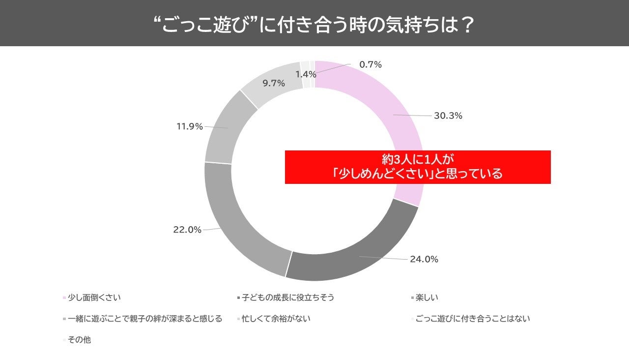 “ごっこ遊び”は子どもが夢中になって取り組む遊びのひとつでありますが、親にとっては日常の忙しさのなかで対応が難しいと感じる場面もあり、「設定についていけない」「繰り返しが多く対応に戸惑う」といった声もあるようです。一方で、「子どもの成長に役立ちそう」(24.0%)、「楽しい」(22.0%)、「一緒に遊ぶことで親子の絆が深まると感じる」(11.9%)など、親の過半数が“ごっこ遊び”に前向きな結果となりした。なかには「思わず笑ってしまうようなやりとりに癒される」「子どもの自由な発想に驚かされる」など、子どもならではの世界観を通じて、親自身も楽しんでいる様子もうかがえます。“ごっこ遊び”は、親子の心をつなぐかけがえのない時間として、多くの家庭で温かく受け止められているようです。