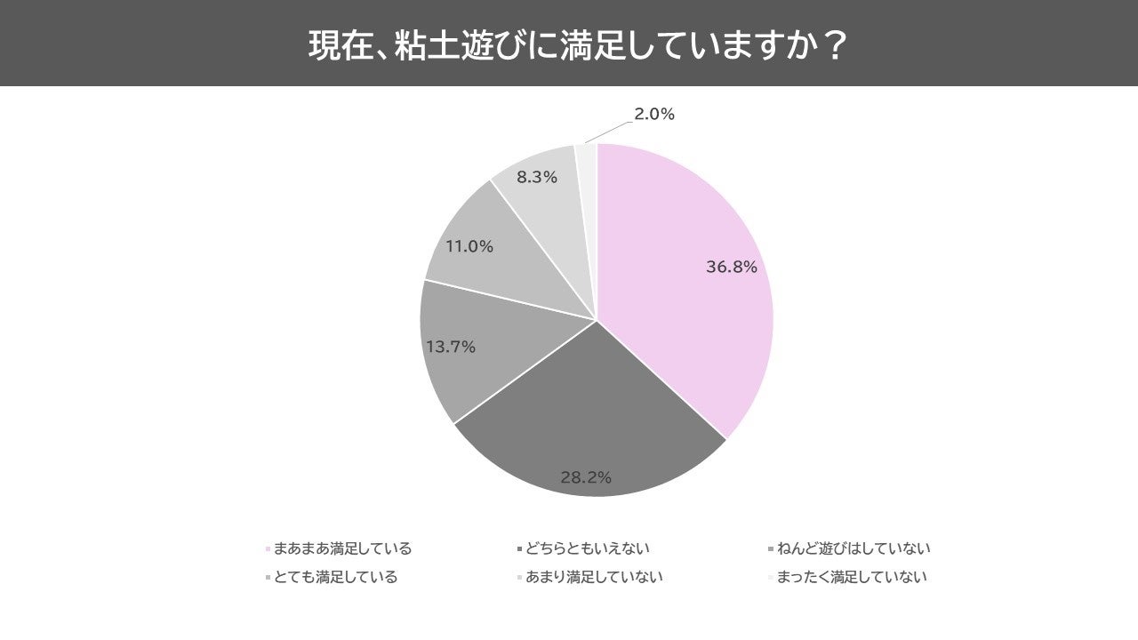 “ごっこ遊び”に使うおもちゃとして親子ともに上位の「ねんど」について、現在の満足度を調査したところ、「まあまあ満足している」(36.8%)が最も多く、「どちらとも言えない」(28.2%)が続きました。また、約1割が「満足していない」と回答するなど、全体として満足度にはばらつきがあることがわかりました。次に、「ねんど遊びがより良くなるために欲しいもの」を尋ねたところ、「片付けが楽」(40.6%)、「色の自由度」(40.1%)、「作れるものの幅広さ」(29.8%)が上位に。機能性や創造性へのニーズが高まっている傾向です。