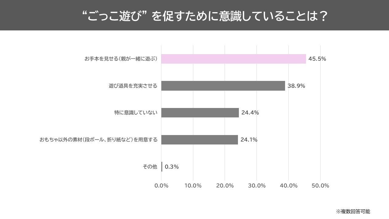 また、“ごっこ遊び”を促すためにどのようなことを意識しているかを尋ねたところ、「お手本を見せる(親が一緒に遊ぶ)」が最多で45.5%という結果に。親自身が関わることで、子どもにとってもより豊かな学びの時間となっているようです。