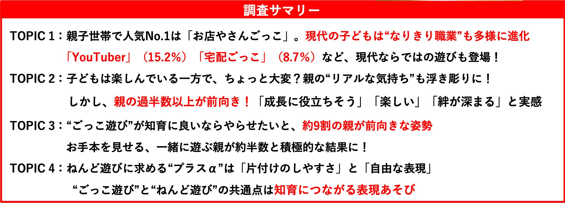 “ごっこ遊び”の幅を広げるねんど遊びや、その遊び方を提案している「プレイ・ドー」を展開する、ハズブロジャパン合同会社(社長:山本直幹)(以下、当社)は、5月5日の「こどもの日」を前に、3〜5歳の子どもを持つ20〜40代の親1,100名を対象に、“ごっこ遊び”に関する意識調査(以下、本調査)を実施しました。本調査では、親世代が子どもの頃に楽しんでいた“ごっこ遊び”と、現代の子どもたちの遊びを比較。時代とともに遊び方に変化が見られる一方で、世代を超えて受け継がれる“ごっこ遊び”の魅力や、育んでほしい力、付き合う親の本音などを調査しました。また、今ならではの遊び方にも着目しています。