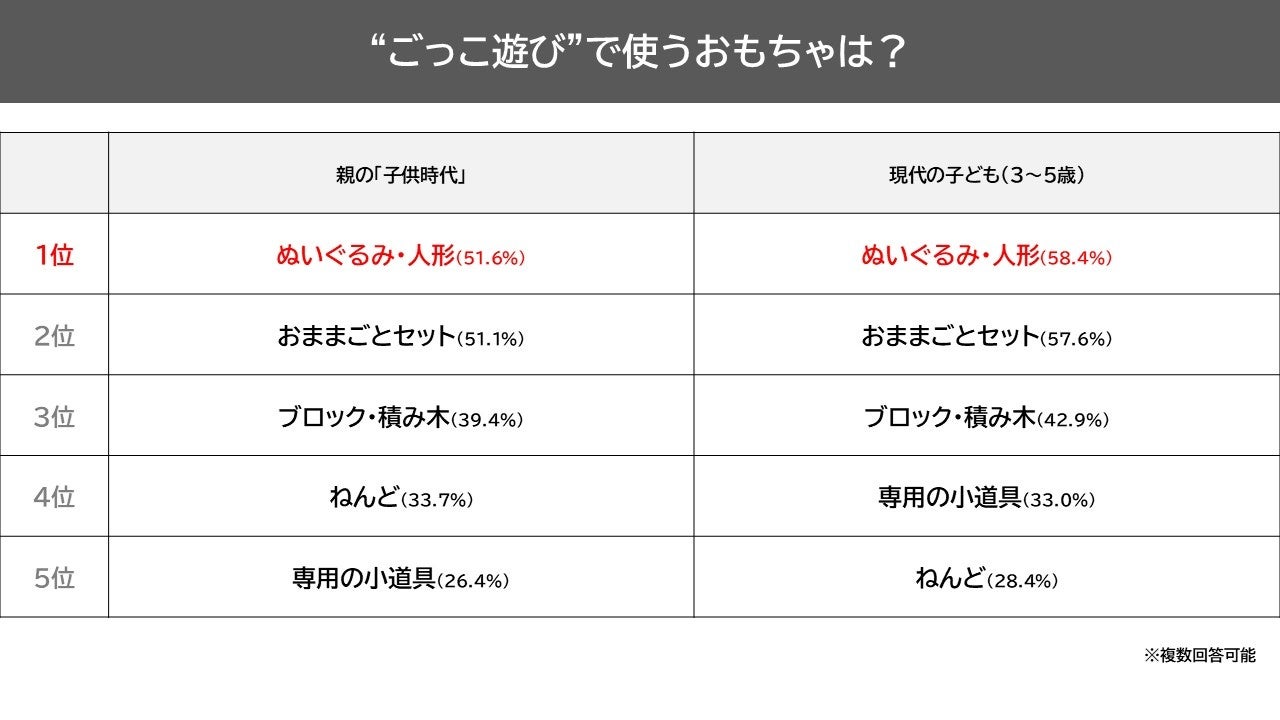 次に“ごっこ遊び”で使用するおもちゃについて質問したところ、上位には「ぬいぐるみ・人形」「おままごとセット」「ブロック・積み木」「ねんど」「ごっこ遊び用の小道具」がランクイン。親世代・子ども世代ともに、遊び道具の傾向に大きな違いは見られず、昔ながらの定番アイテムが今もなお、子どもたちの遊びに根付いていることがわかりました。
