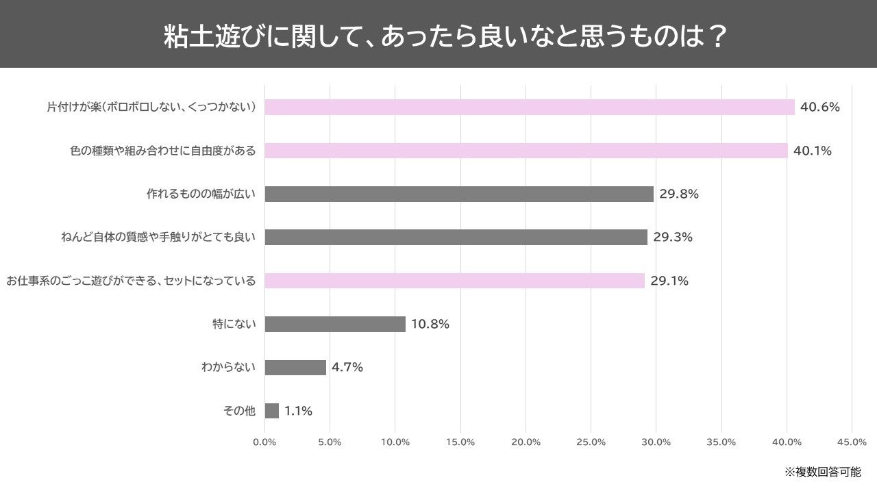 さらに、ねんど遊びについて、「とても満足している」「まあまあ満足している」と回答した人の“これがあるともっと良い”と感じるポイントをみると、「色の種類や組み合わせに自由度があること」や、「お仕事系(お店屋さんごっこなど)のごっこ遊びができるセット」が上位にあがりました。満足している中でも、より創造性や“ごっこ遊び”の広がりを期待する声が多く見られました。子どもたちの想像力やコミュニケーション力を育む“ごっこ遊び”は、知育にもつながる大切な遊びのひとつです。同じく“ねんど遊び”も、自由な発想で形を作る中で、創造力や集中力を養うことができるとされています。どちらも“自分で考え、自由に表現する”という点で通じており、子どもたちの成長をやさしく後押ししてくれる存在であることがわかります。